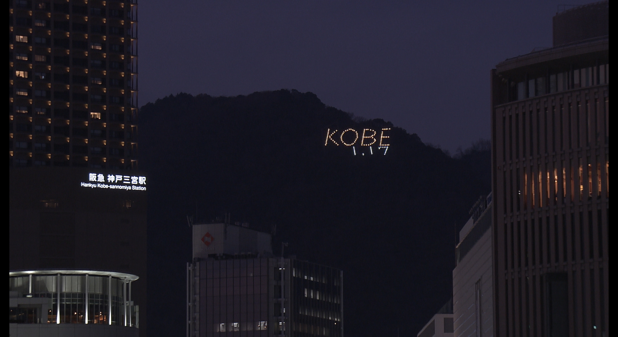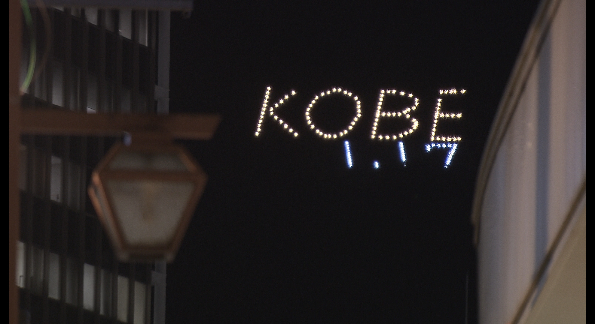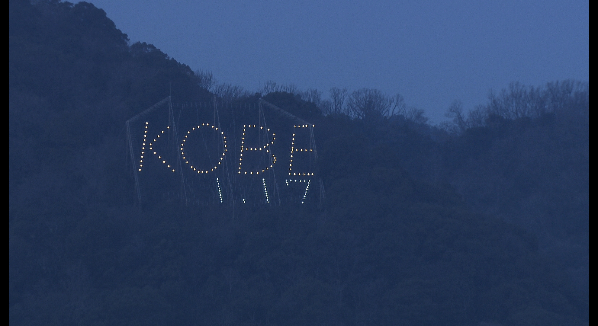 16日午後5時過ぎ、六甲山系の堂徳山に「KOBE1.17」の文字が灯りました。