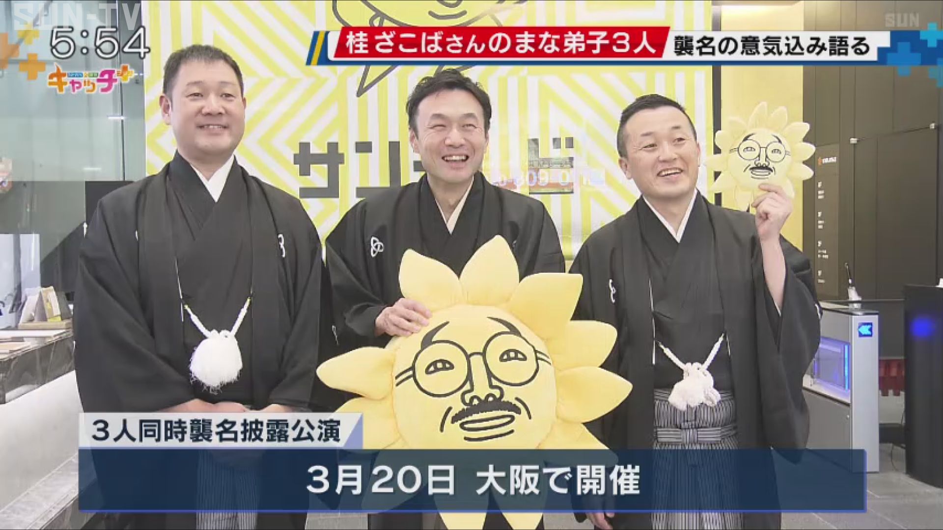 2024年6月に亡くなった落語家・桂ざこばさんのまな弟子3人がサンテレビ本社を訪れ、2025年3月の襲名披露を前に意気込みを語りました。