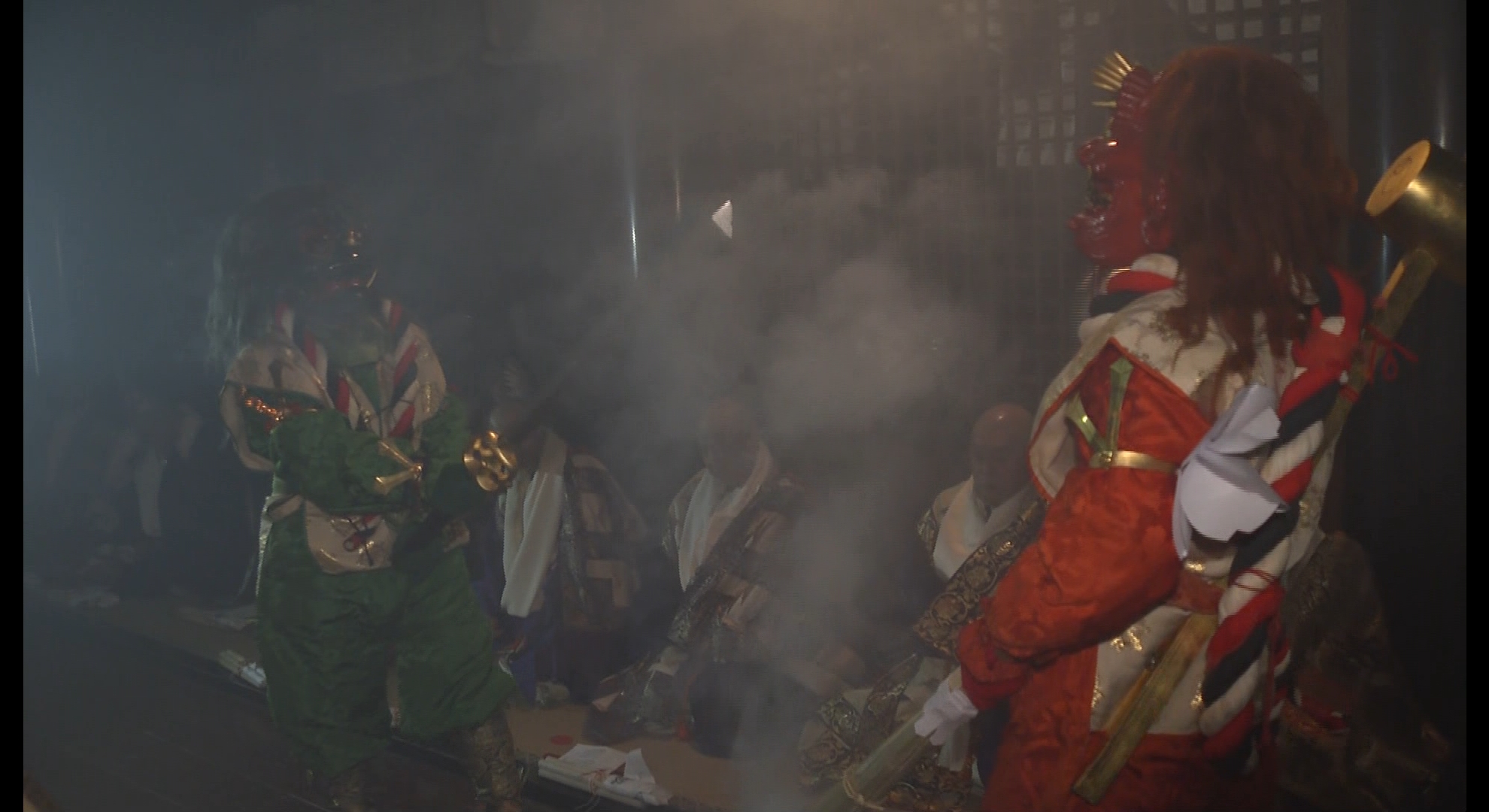 この赤鬼は毘沙門天、青鬼は不動明王の化身とされ大きく振り上げた脚でしこを踏みしめて災いをはらい五穀豊穣をもたらせます。