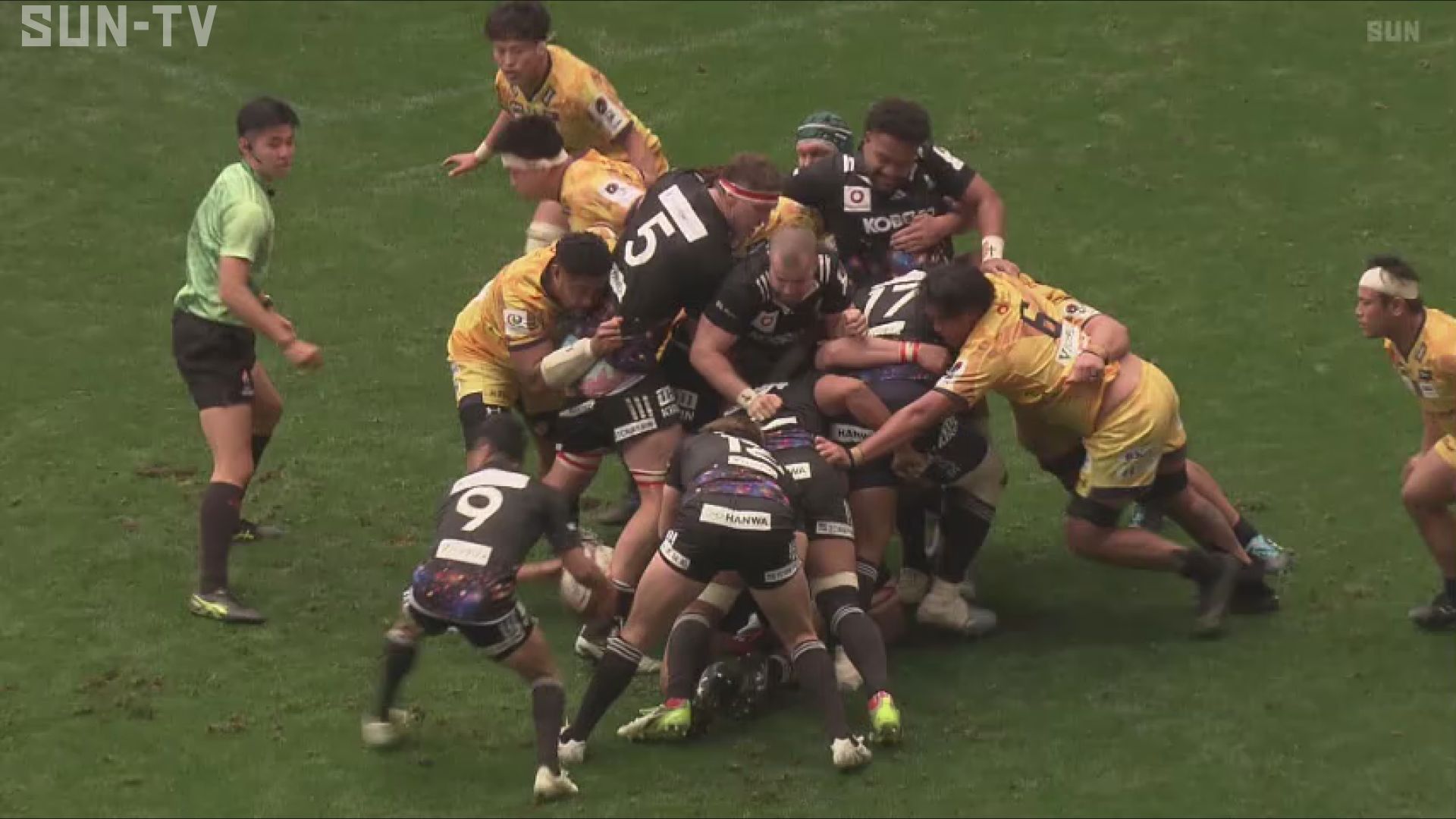 黒のジャージーの神戸は前半2分、神戸市垂水区出身の船曳のビッグゲインでチャンスを作ると、ラックから抜け出したキャプテンのレタリックがトライ。