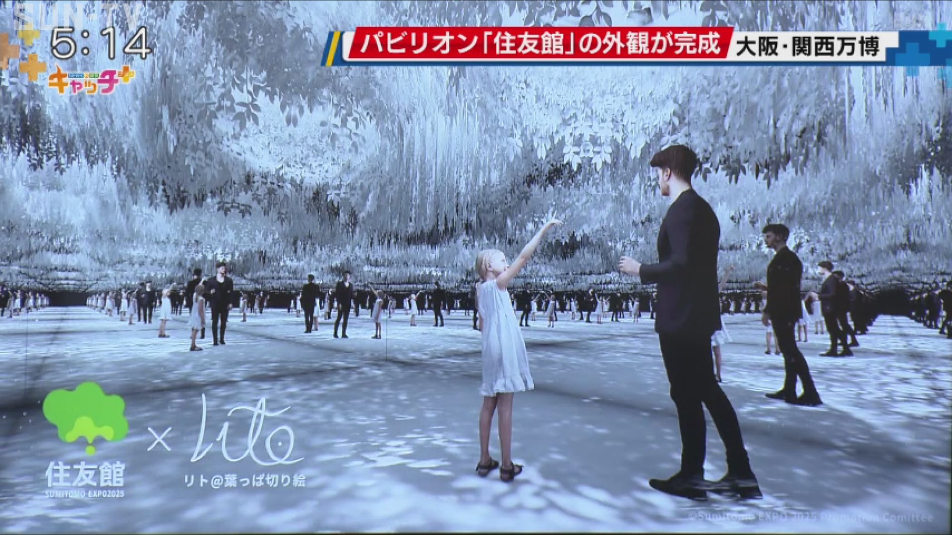 23日はパビリオンの内部も一部公開され、SNSなどで人気の葉っぱ切り絵アーティストリトさんが、住友館で展示されるコラボ作品を紹介しました。