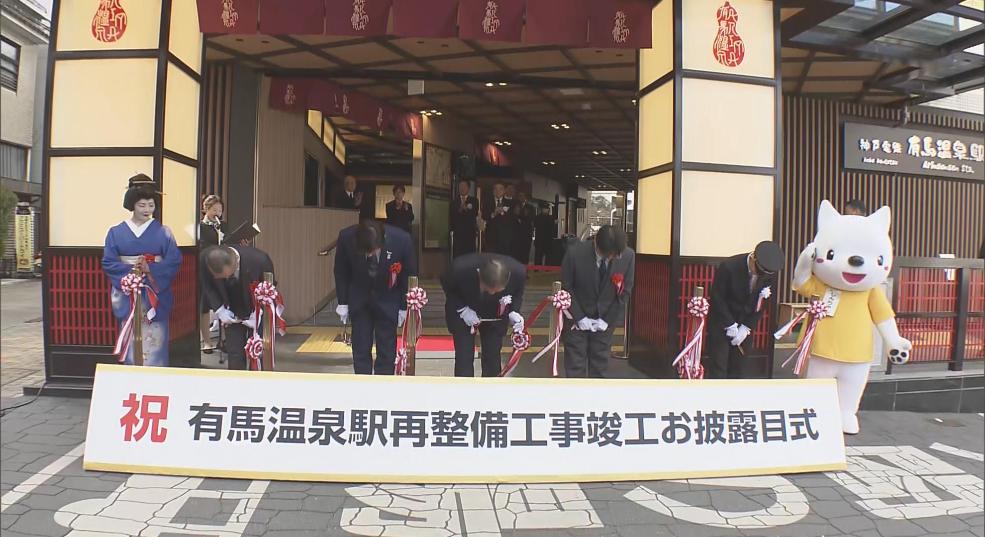 神戸電鉄有馬温泉駅の供用開始を記念した式典には、神戸市の久元市長らが出席し、リニューアル工事を終えた駅舎の完成を祝いました。