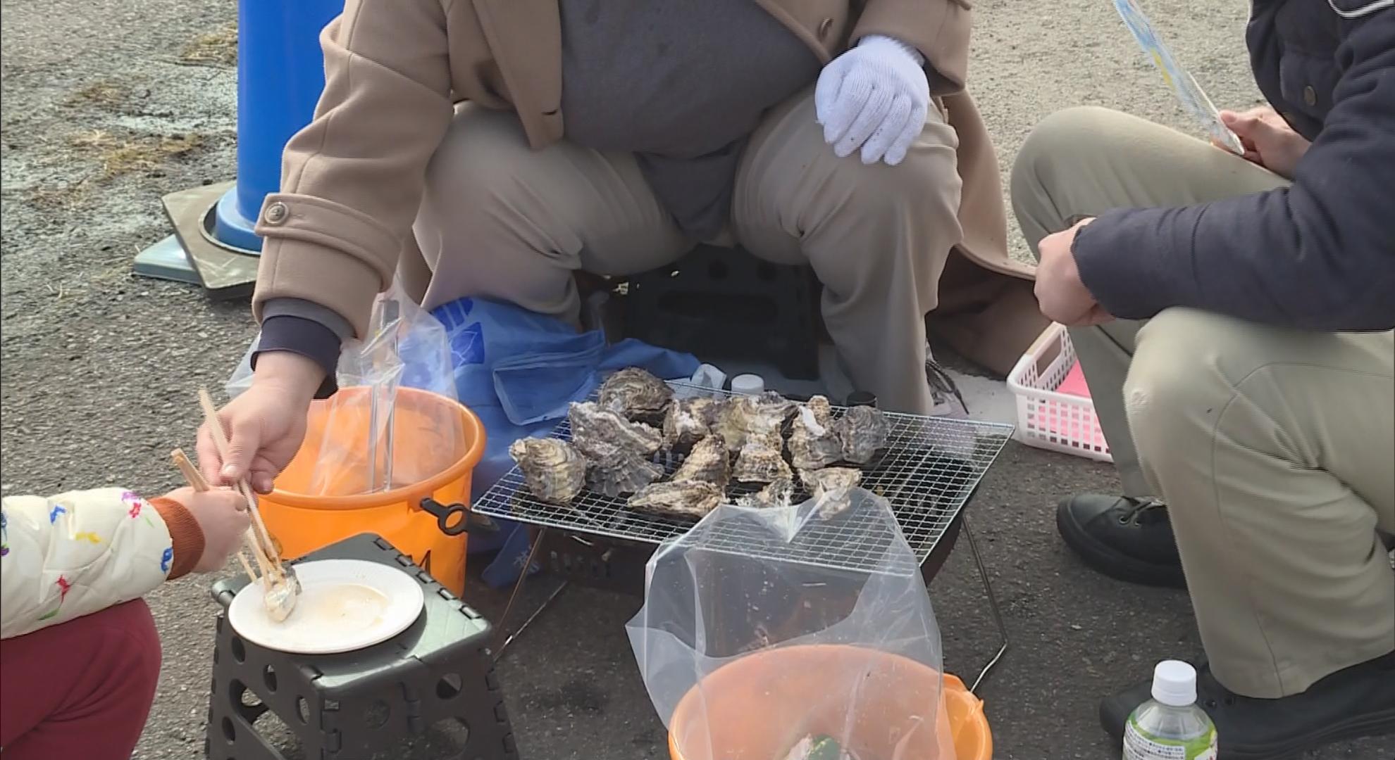 また、お土産用に格安価格の生ガキも販売された他、殻付きのカキを炭火で焼く、バーベキューコーナーも設けられ訪れた家族連れらが、カキづくしのイベントを楽しんでいました。