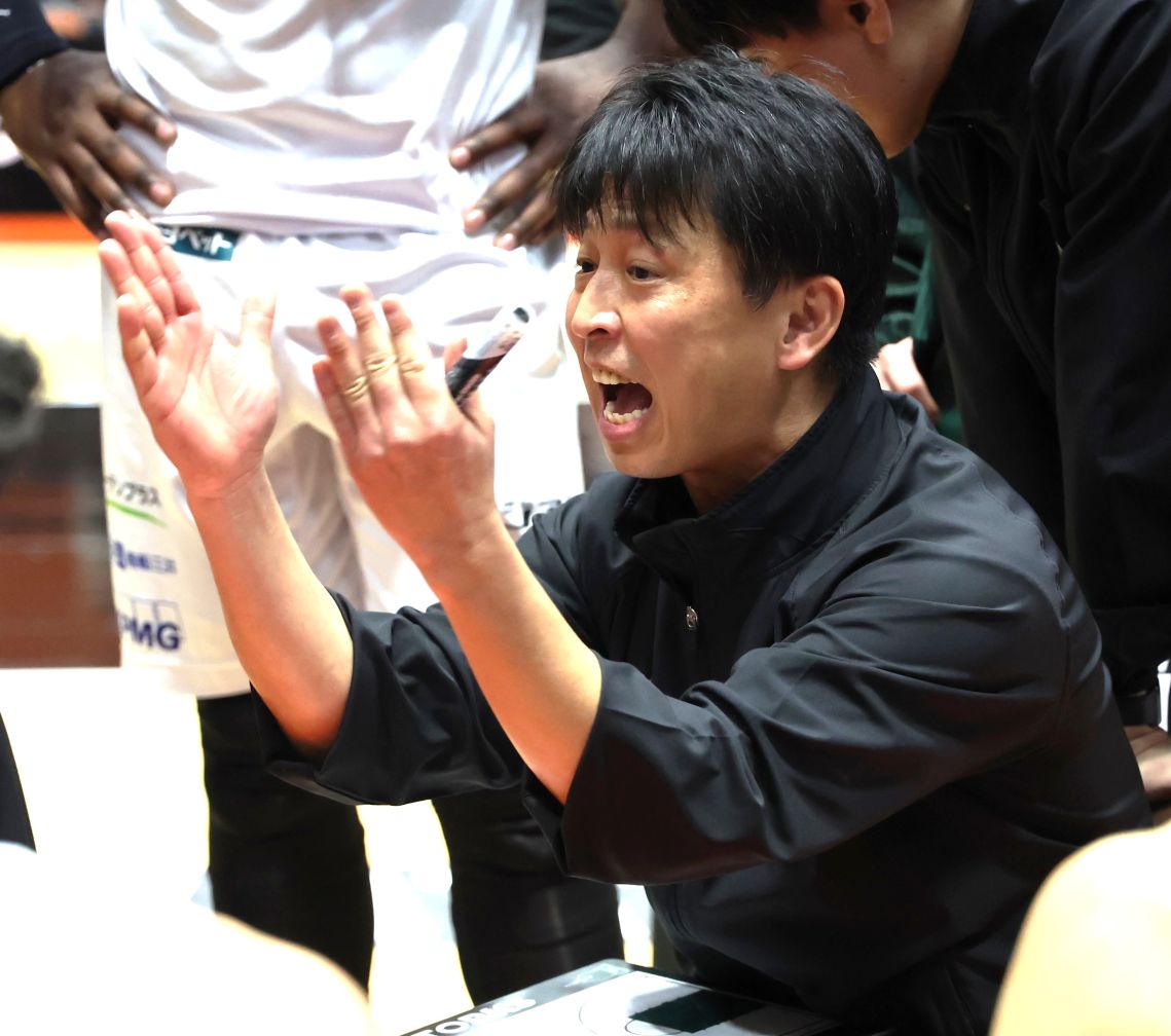 初采配の東頭俊典ヘッドコーチ(2月21日 愛媛戦) /©B.LEAGUE