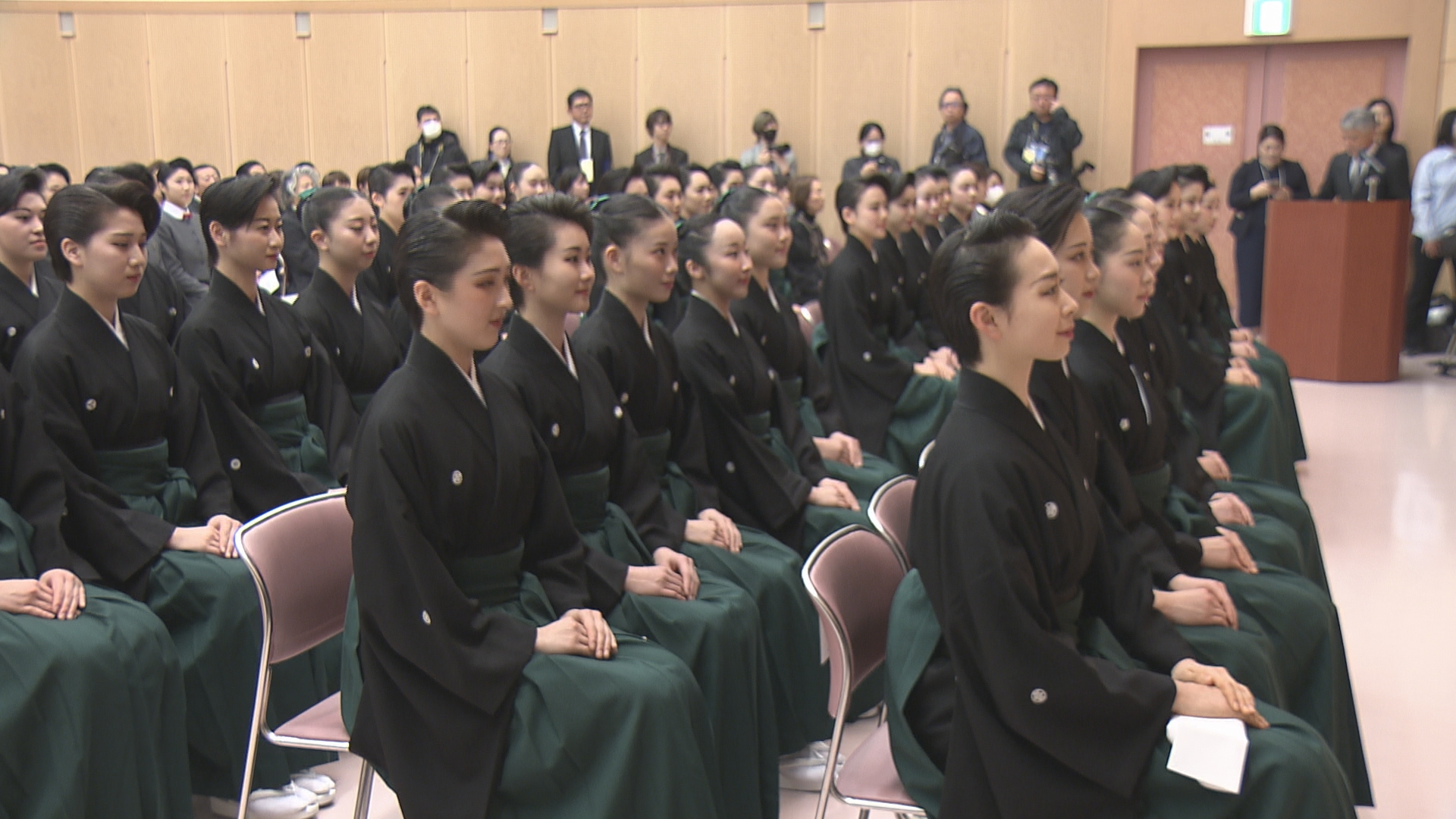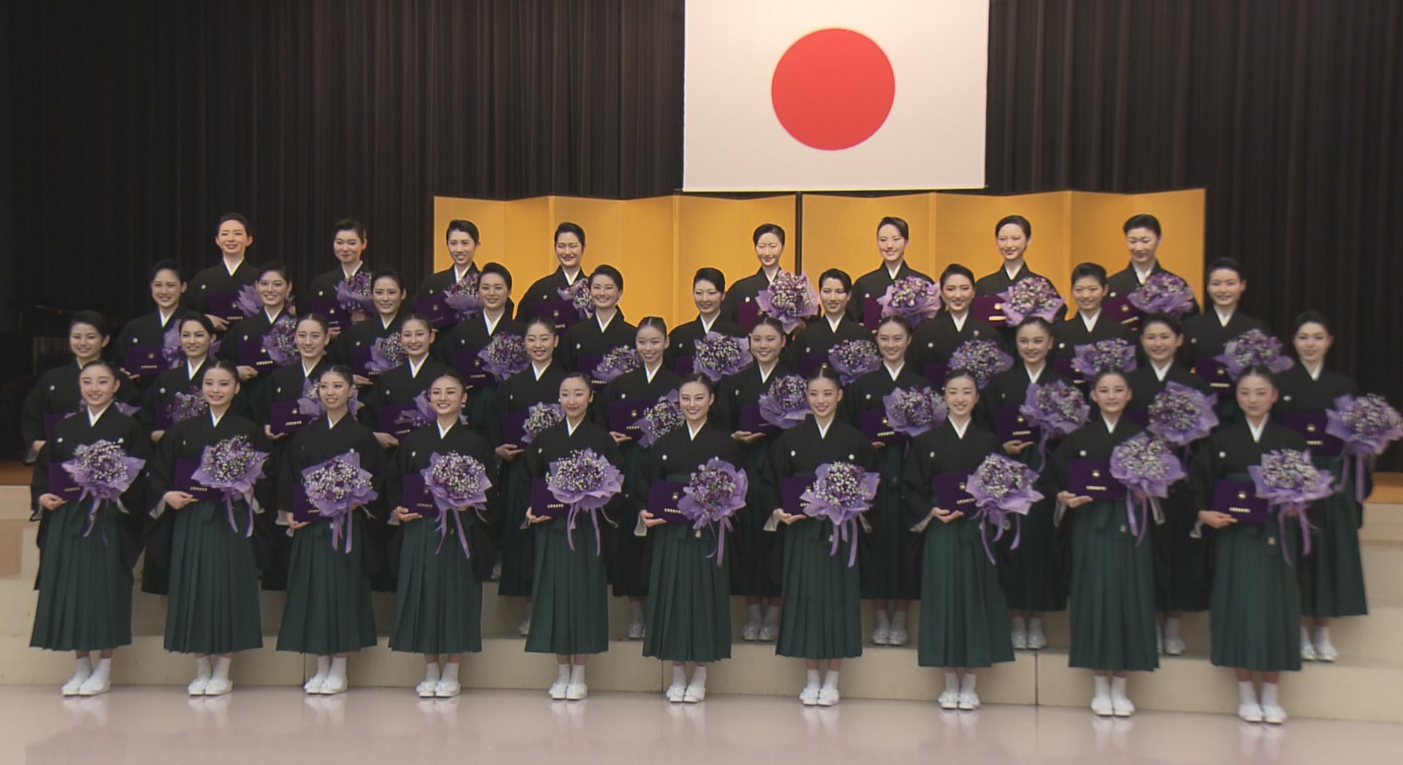 黒紋付にはかま姿で、晴れやかな表情を見せる生徒たち。門出の日を迎えた宝塚音楽学校の第111期生39人です。