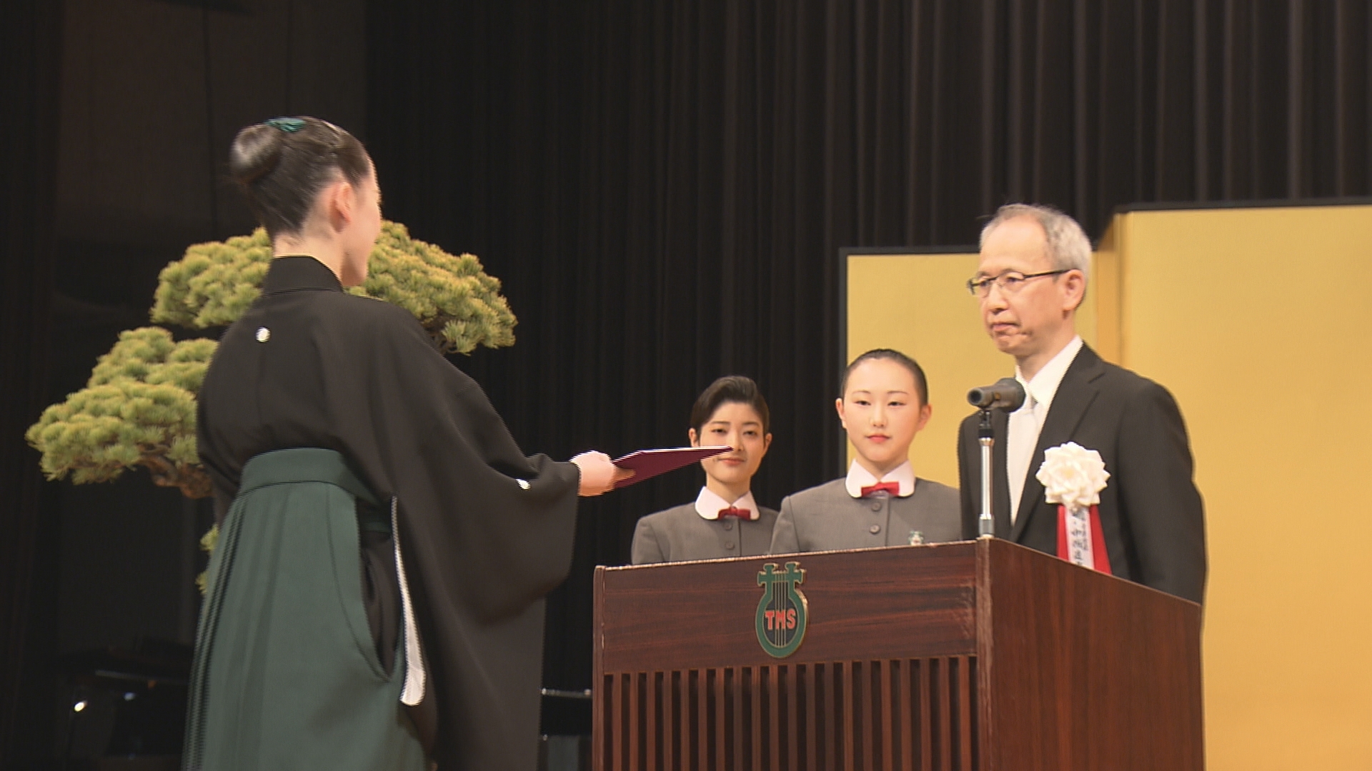 卒業生たちは、時折涙を見せながら歌を歌い、2年間過ごした学びやに別れを告げていました。