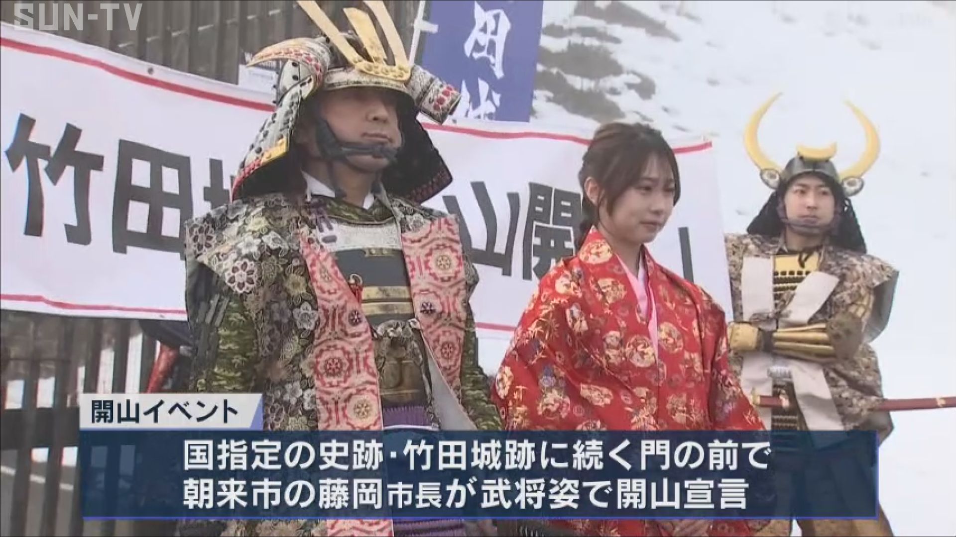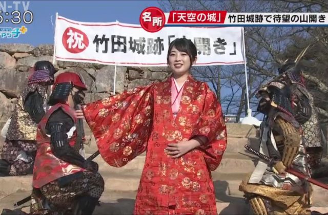 国指定の史跡・竹田城跡に続く門の前では今シーズンの開山を知らせるイベントが行われ、武将に扮した朝来市の藤岡市長が開山宣言を行いました。