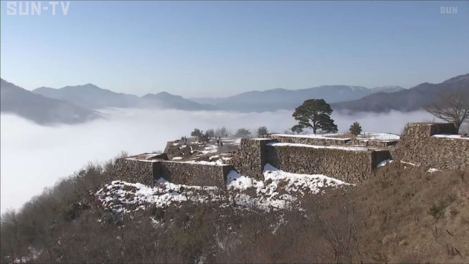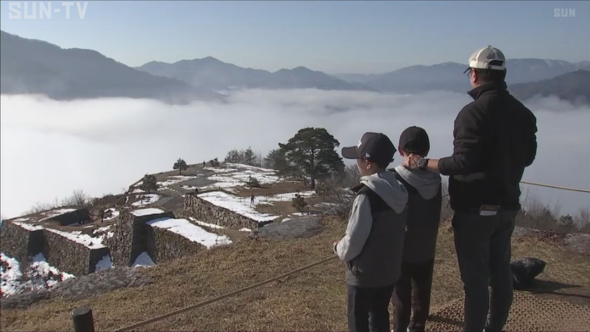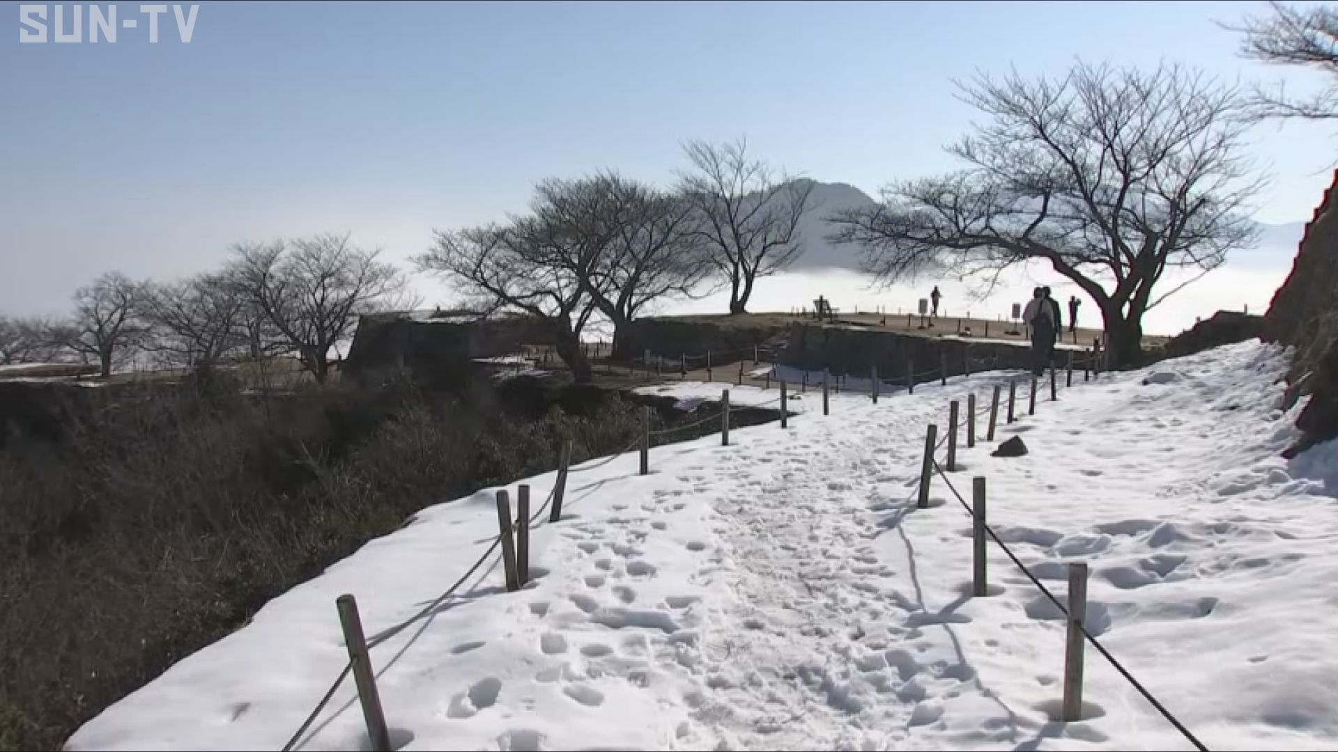 晴天に恵まれた1日朝は雲海が見られ、訪れた人は雪に覆われた石垣と共に、幻想的な風景を眺めていました。