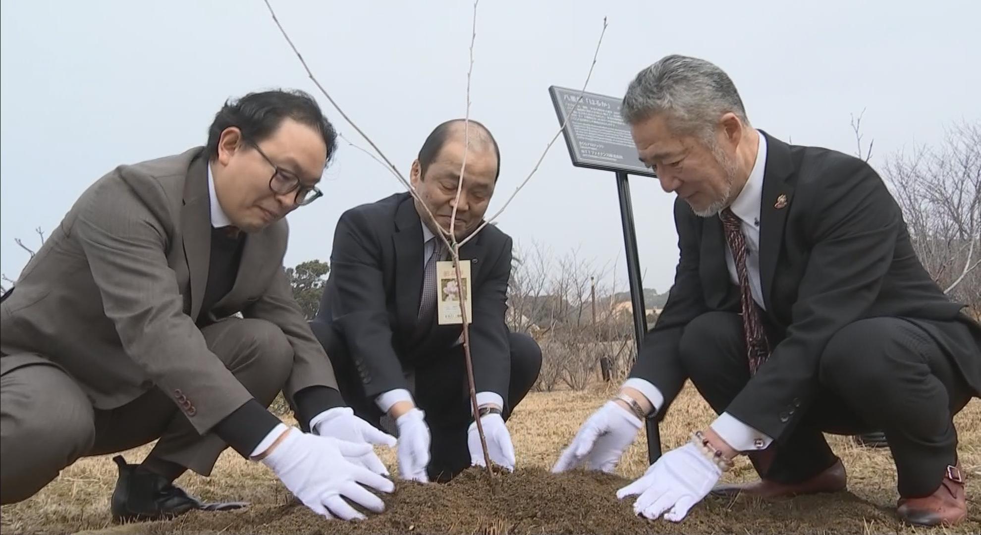 東日本大震災からまもなく14年 福島で育てられたサクラの苗木を淡路に植樹 2025.03.0122:39 地域・まち 「はるか」の植樹式 東日本大震災からの復興を願い福島県で育てられたサクラの苗木が兵庫県淡路市に贈られました。 阪神淡路大震災の記憶を伝える淡路市の北淡震災記念公園では、八重桜「はるか」の植樹式が開かれました。 「はるか」は、東日本大震災からの復興のシンボルとして全国各地に贈られていて、今回は7本の苗木が植えられました。 兵庫県内に「はるか」が植えられるのは、豊岡市出石町に続き2カ所目となります。 苗木は早ければ2026年の春に花をつけるということです。 #はるか #八重桜 #東日本大震災 #植樹 記事のギャラリーを見る ニュース一覧へ戻る