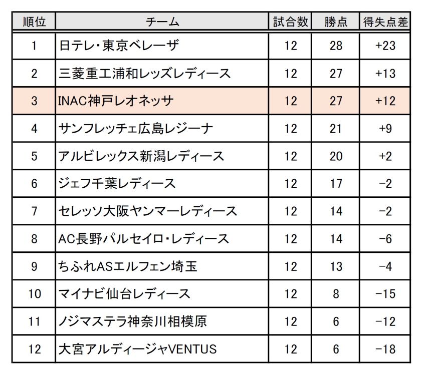 INAC神戸は12試合を戦って8勝3分1敗、勝点27。