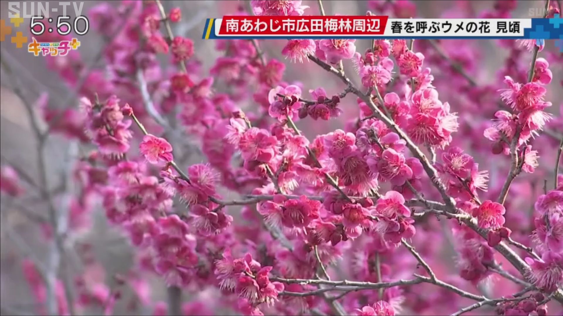 淡路島を代表するウメの名所・南あわじ市の広田梅林周辺では、春の訪れを告げる花が紅白に麗しく咲き、春の足音を届けています。