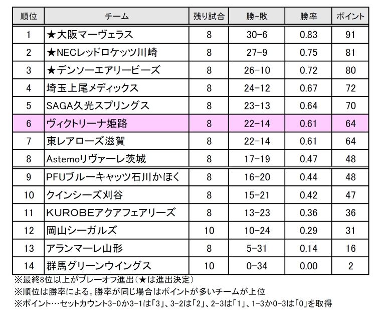 ヴィクトリーナ姫路は連敗して順位を1つ落とし、6位に後退した。