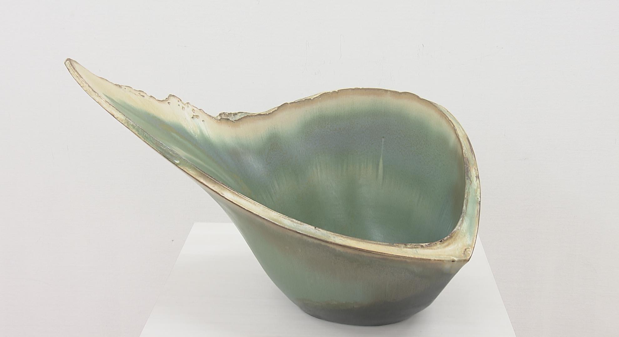 波や風をイメージした形と鮮やかな青が印象的な陶芸作品。