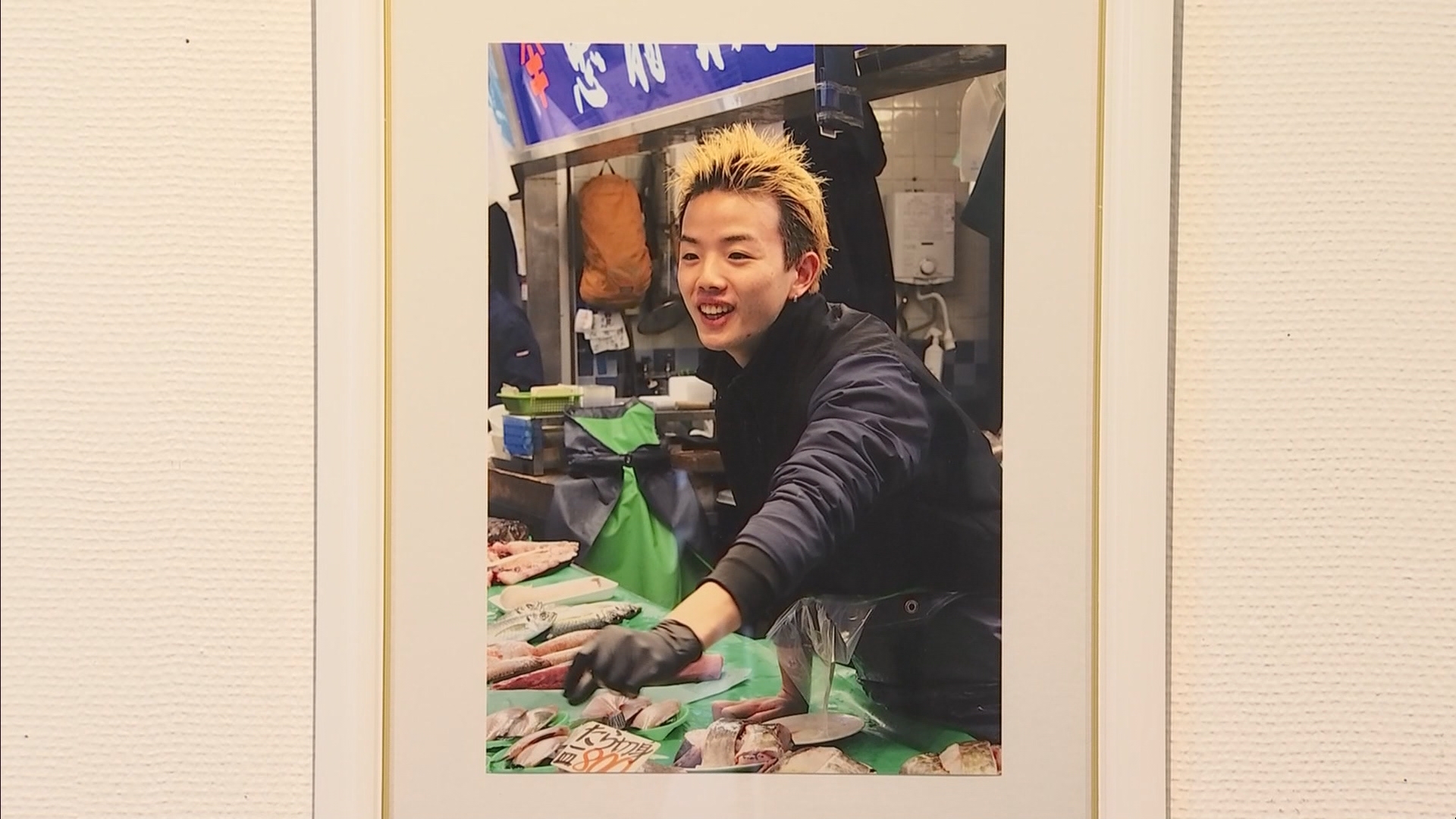 市場で青年の威勢のいい接客風景を撮影した「今日のおススメ!!」
