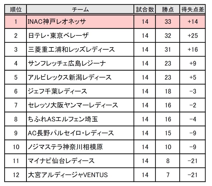 INAC神戸は勝点を「33」に伸ばし首位をキープしたが、2位の日テレ・東京ベレーザ、3位の浦和も勝ち、勝点それぞれ「1」差で続いている。