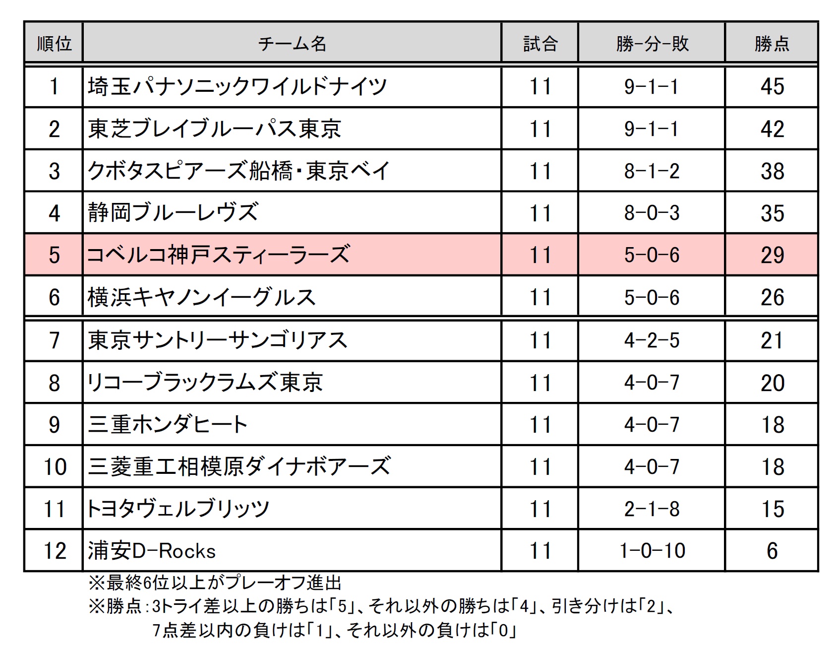 神戸スティーラーズは三重戦の勝利で、3トライ差以上の勝ちに与えられるボーナス点「1」を合わせて、勝点「5」を獲得し5位に浮上。