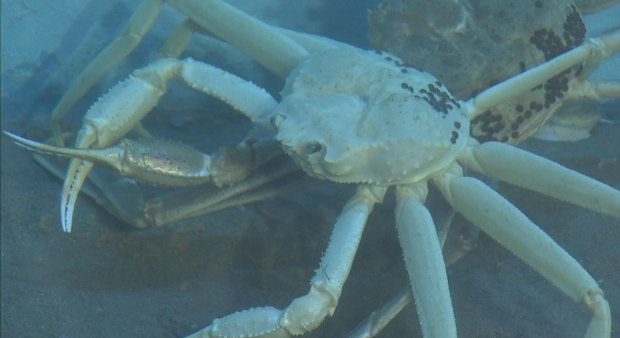 部分的に体が白いカニは時折あるそうですが、甲羅も脚も含めて全身が白く、大型のものは非常に珍しいということです。