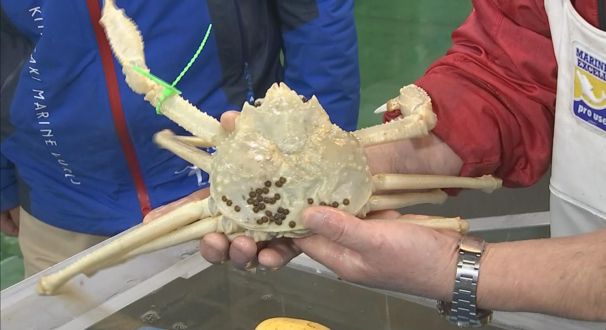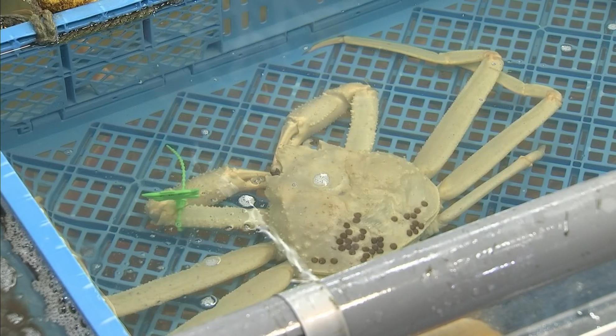 兵庫県香美町の漁港で2025年2月に水揚げされ、町内の水産物店で展示されていた白いマツバガニが28日、城崎マリンワールドに引き渡されました。