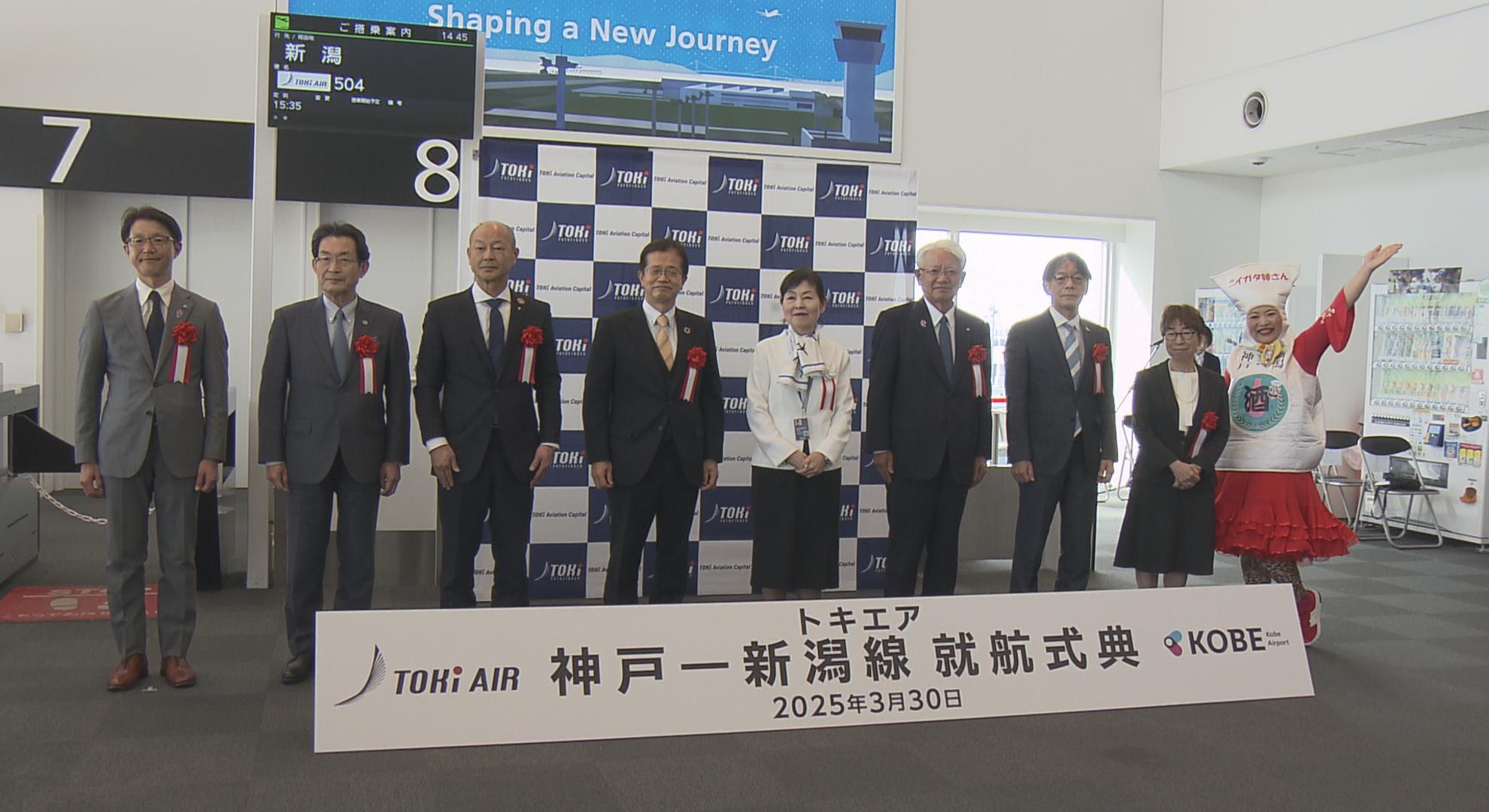 神戸と新潟の空を結ぶ「トキエア」が就航し神戸空港で記念のセレモニーが開かれました。