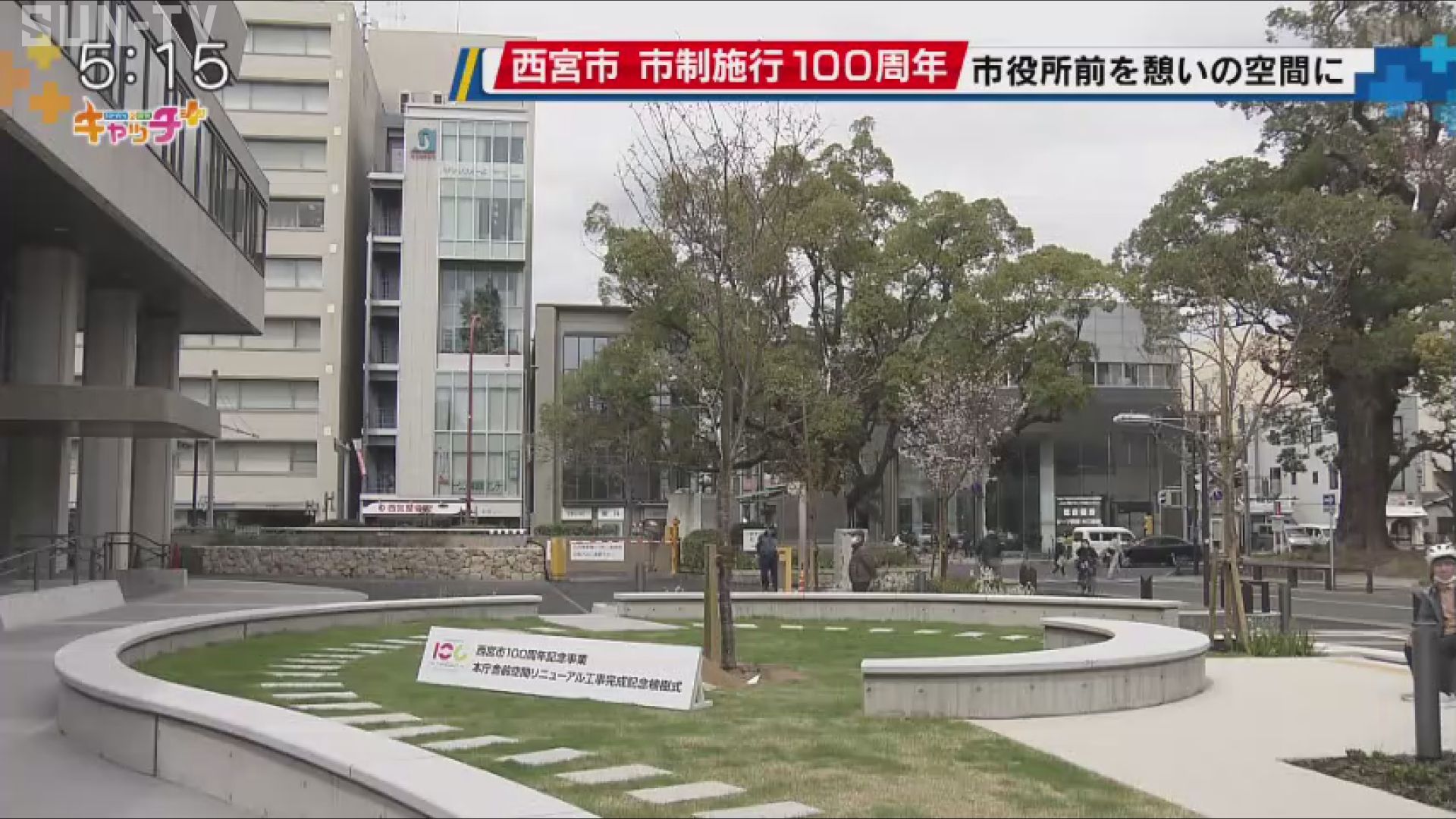 4月1日、市制施行100周年を迎えた西宮市では、市役所の駐輪スペースに天然芝やベンチなどを配置したリニューアル工事が完了し、1日から一般開放されています。