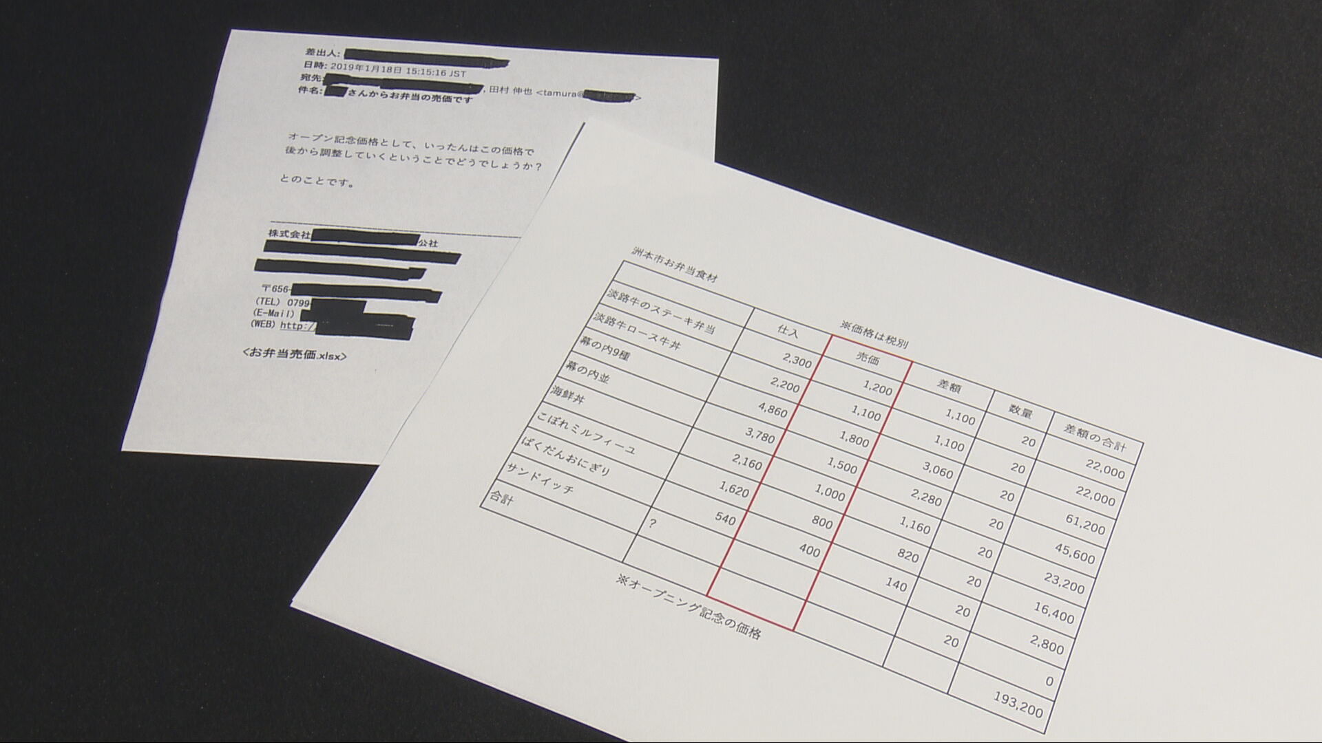 サンテレビは元課長が指示したとされる弁当の価格表を入手しました。オープンに間に合わせるため、元課長はかつて料理人でもあった田村さんの会社に仕入れを促し、「仕入れ値よりも安く売れ」と指示。
