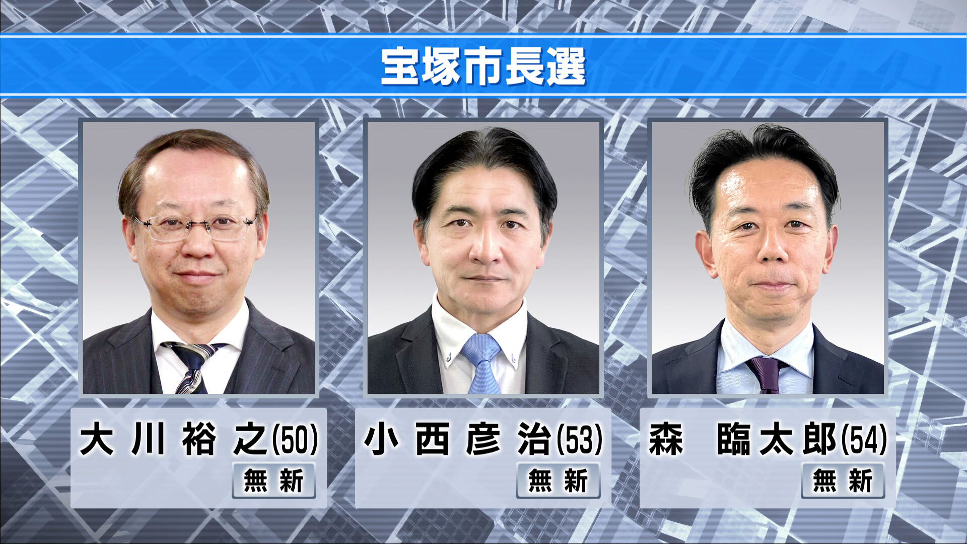 宝塚市長選に立候補したのは、届出順にいずれも無所属・新人で元宝塚市議の大川裕之(おおかわひろゆき)さん(50)、元兵庫県議の小西彦治(こにしひこじ)さん(53)、小児科医・森臨太郎(もりりんたろう)さん(54)の3人です。