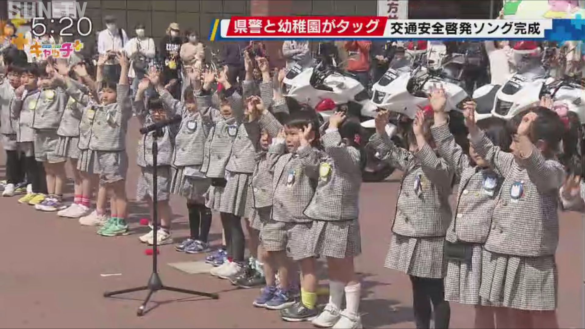 式では県警が作詞し、この幼稚園の理事長が作曲を担当した啓発ソングがお披露目され、子どもたちが元気いっぱいの歌とダンスで交通事故防止を呼び掛けました。