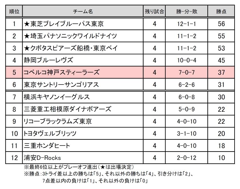 神戸スティーラーズは連勝が止まり、7勝7敗と五分の星となったが、5位にとどまりPO圏内をキープしている。