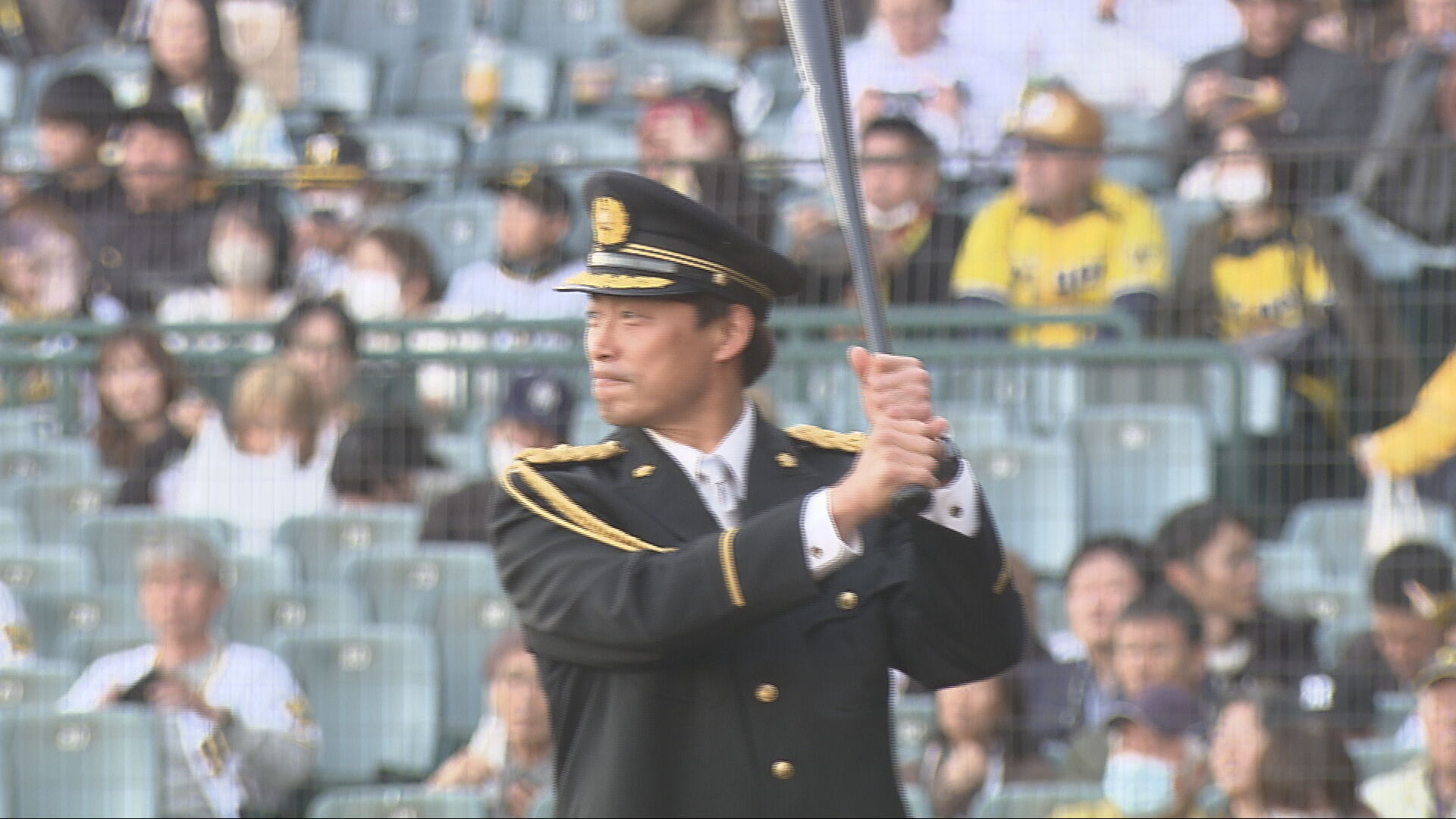 警察の制服に身を包み、現役さながらの豪快なスイングを披露して、満員のスタンドを湧かせました。