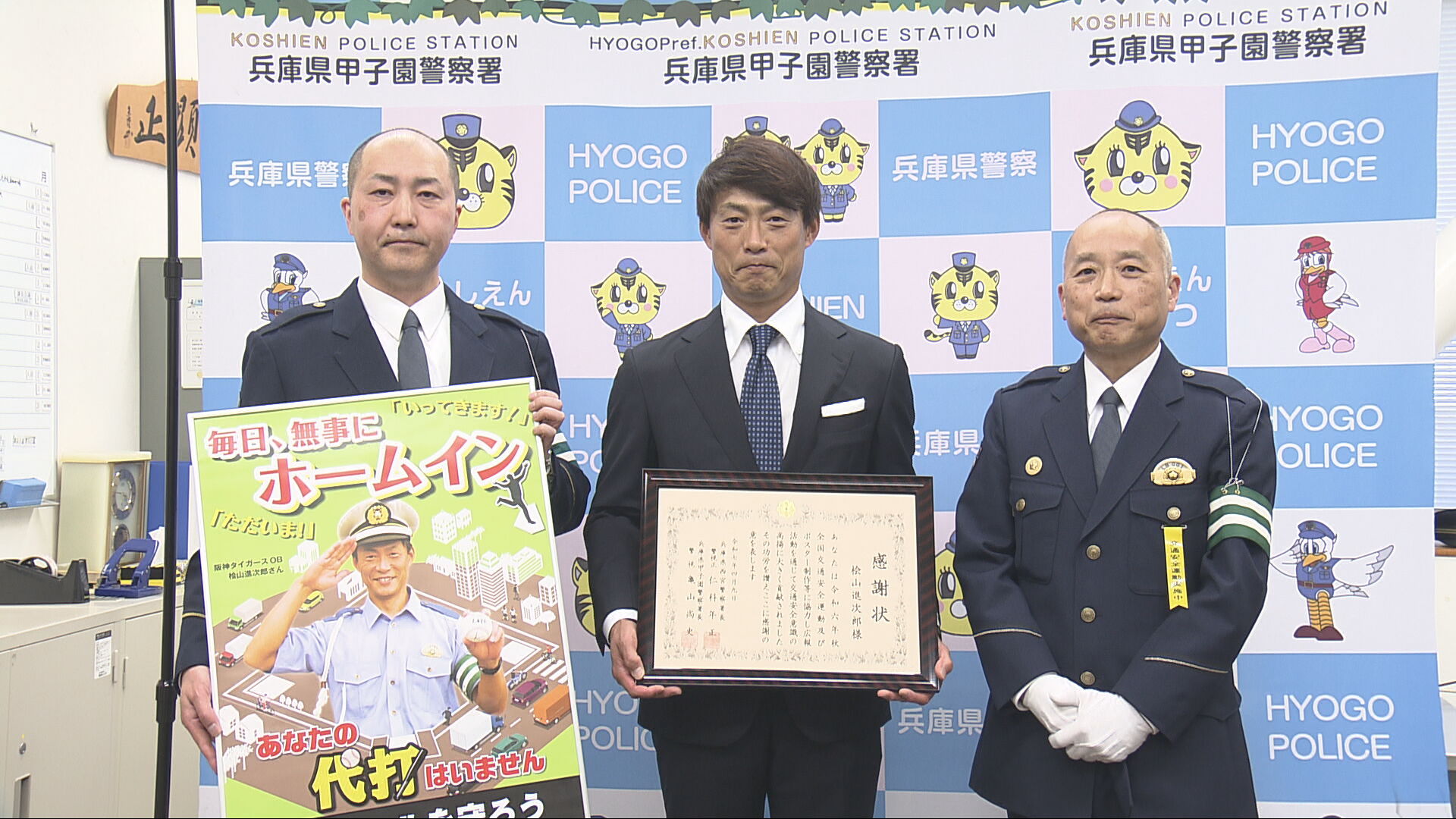 桧山さんは2024年、西宮警察署の一日警察署長として、交通安全を呼び掛けたほか、この日お披露目された啓発ポスターのモデルをつとめ、交通安全活動に大きく貢献したとして、感謝状が贈呈されました。