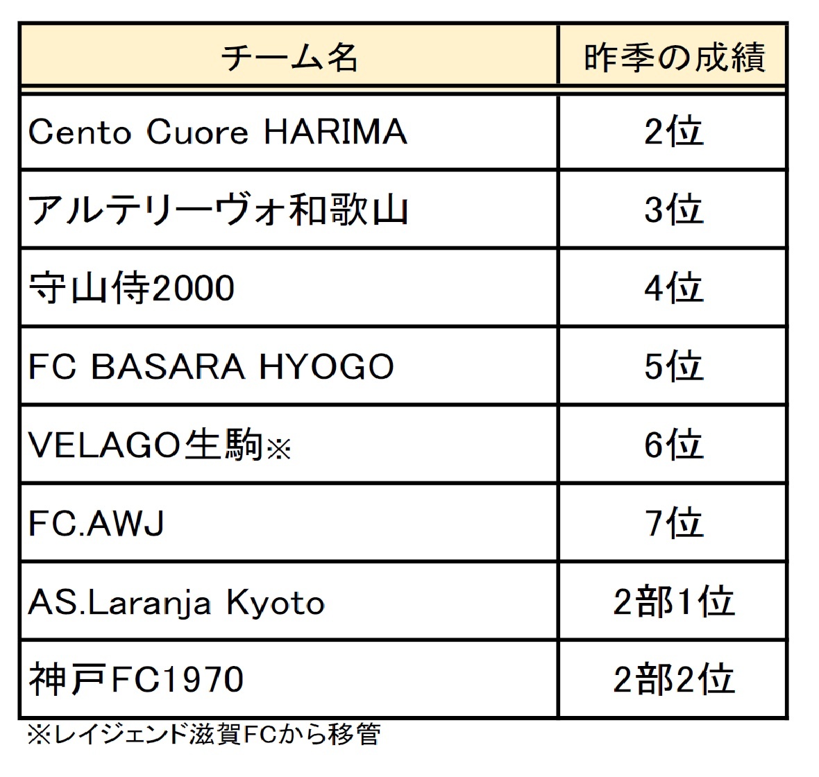 昨シーズン優勝した飛鳥FCはJFLに昇格し、チェントクオーレハリマは惜しくも2位に終わった。