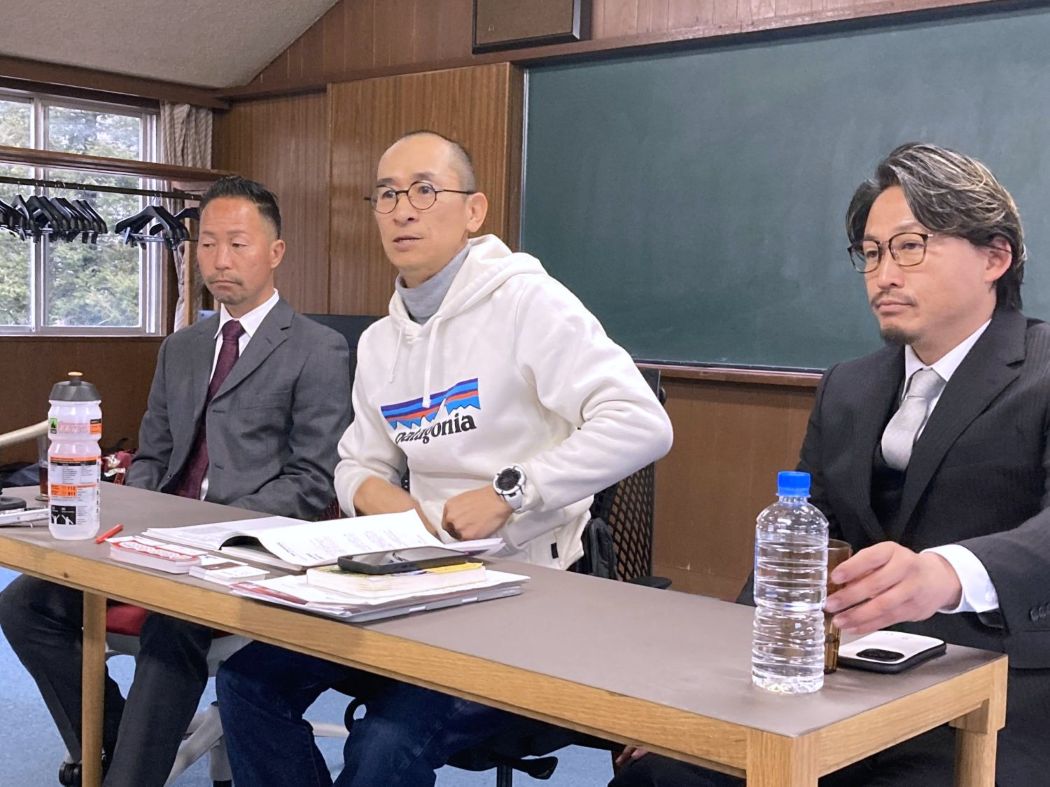記者会見する (中央)ムサシ・岡田篤社長、(左)佐野裕哉監督、(右)大塚靖治チーム代表 /3月29日