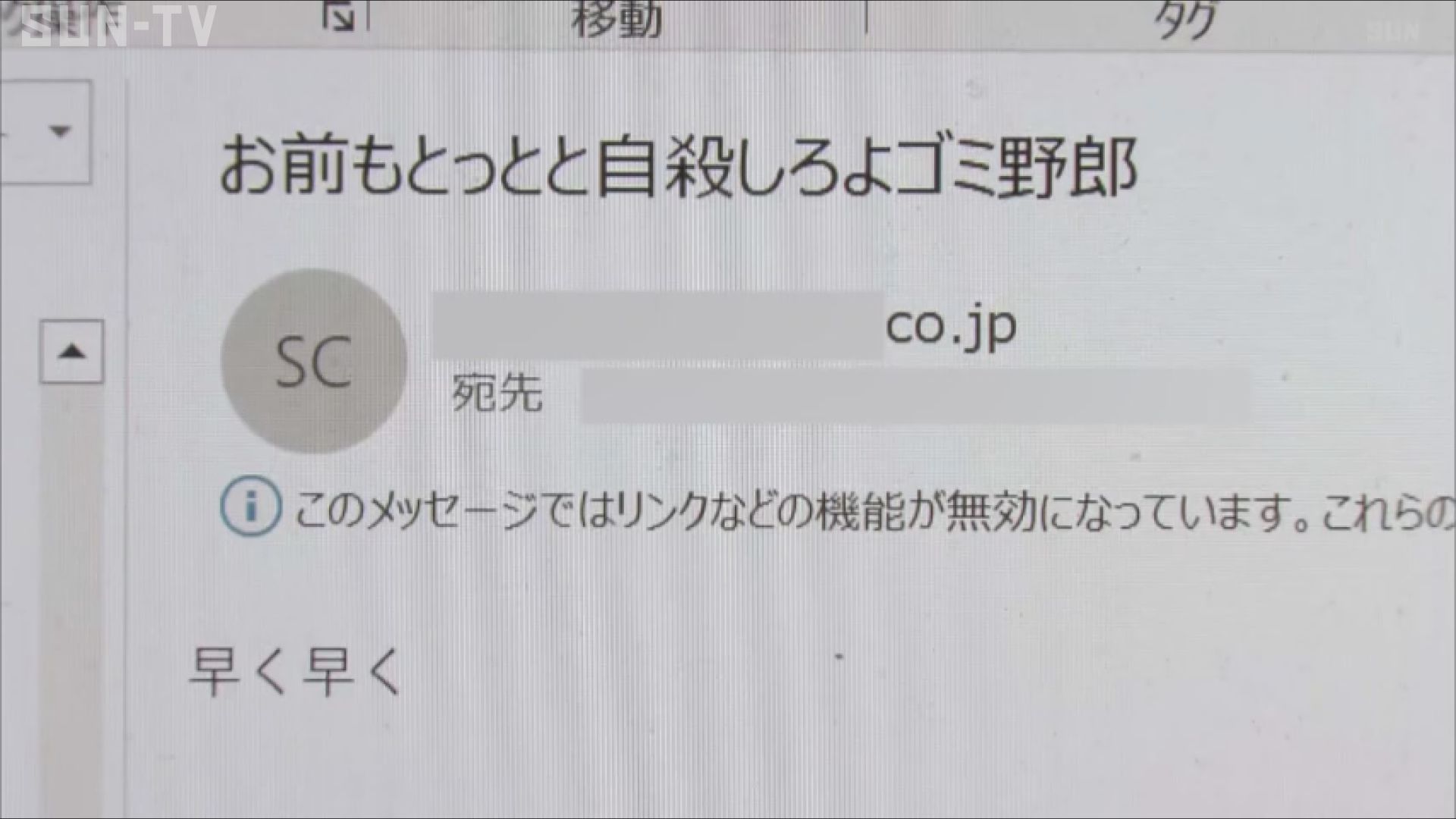 件名には、「お前もとっとと自殺しろよゴミ野郎」や「お前も県民局長みたいに自殺しろよ」と書かれ、メッセージ欄には「早く早く」と記されていました。