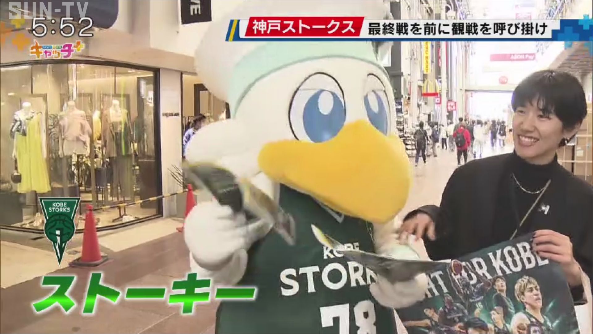 神戸・三宮センター街に現れたのは、「神戸ストークス」のマスコットキャラクターストーキーです。