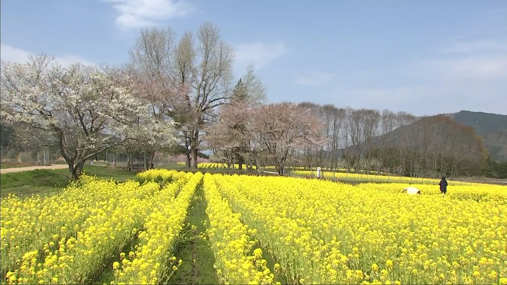 菜の花は周辺のサクラの開花時期に合わせ植えられていて、青空の下、訪れた観光客たちは斜面に広がる色鮮やかなサクラと菜の花の共演を楽しんでいました。