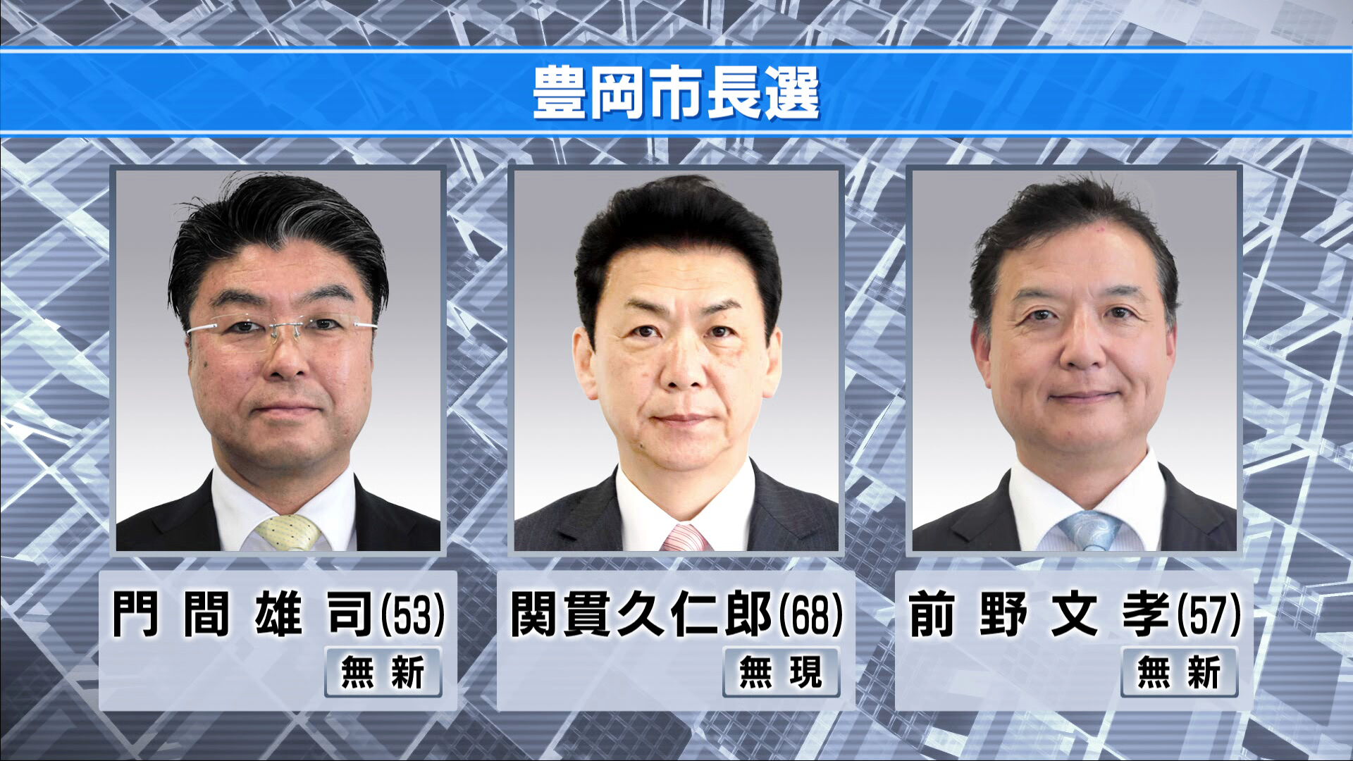 豊岡市長選に立候補したのは、届け出順に、いずれも無所属で、新人で元県議の門間雄司さん(53)、現職の関貫久仁郎さん(68)、新人で元副市長の前野文孝さん(57)の3人です。