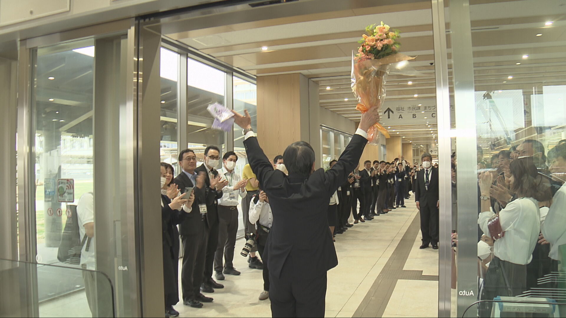 市役所には多くの市民が集まり、藤原市長は職員や市民たちに見送られ最後の公務を終えました。