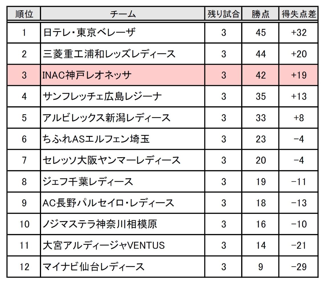 3位INAC神戸はセレッソを破り、勝点「42」としたが、首位の日テレ・東京ベレーザ(東京NB)と、2位・三菱重工浦和レッズレディースもともに勝ち、前節から順位は変わらない。
