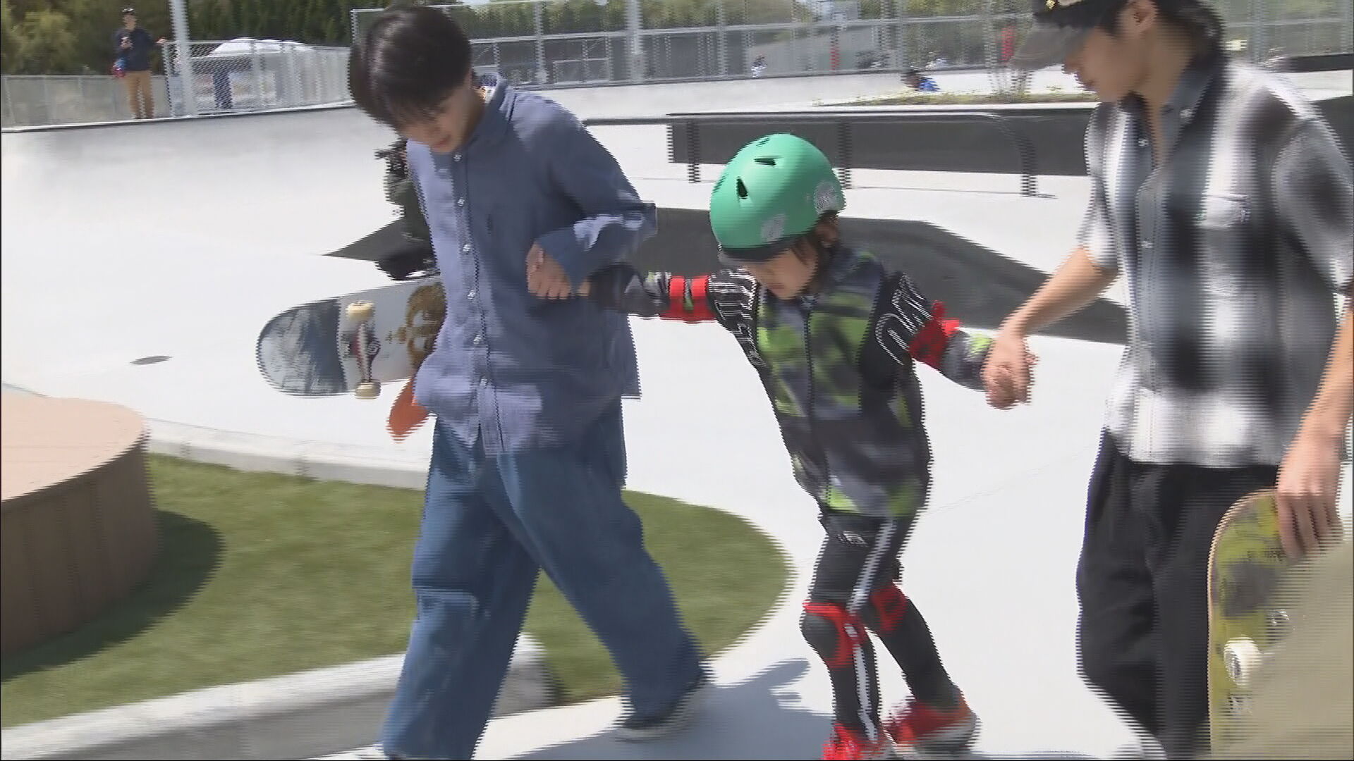 この他、初心者向けの体験会も行われ、スケートボード初体験の子どもたちは、手を持ってもらいながら、プロからボードの乗り方などを学んでいました。