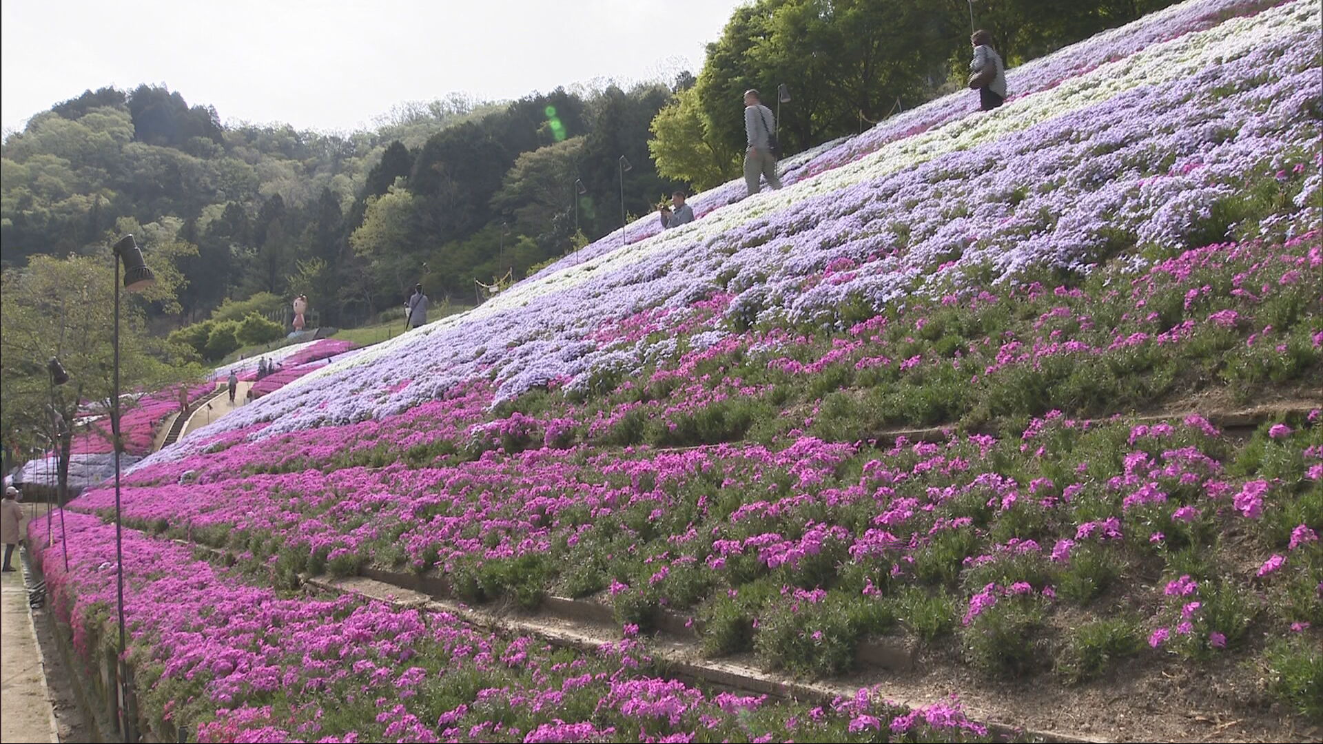 兵庫県姫路市夢前町に本社工場を置く「ヤマサ蒲鉾」の裏山では6500平方メートルの敷地に植えられた約21万株のシバザクラが見頃を迎えています。