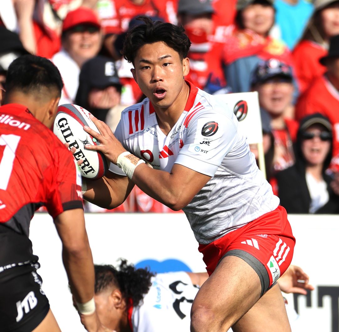 しかし人数が戻ったキヤノンに30分からの5分間で3連続トライを返され、11点差まで迫られたが、38分、リーグ戦初出場のアーリーエントリー選手・辻野隼大(ユーティリティバックス 京都成章高-京都産業大)がトライを決め、突き放した。