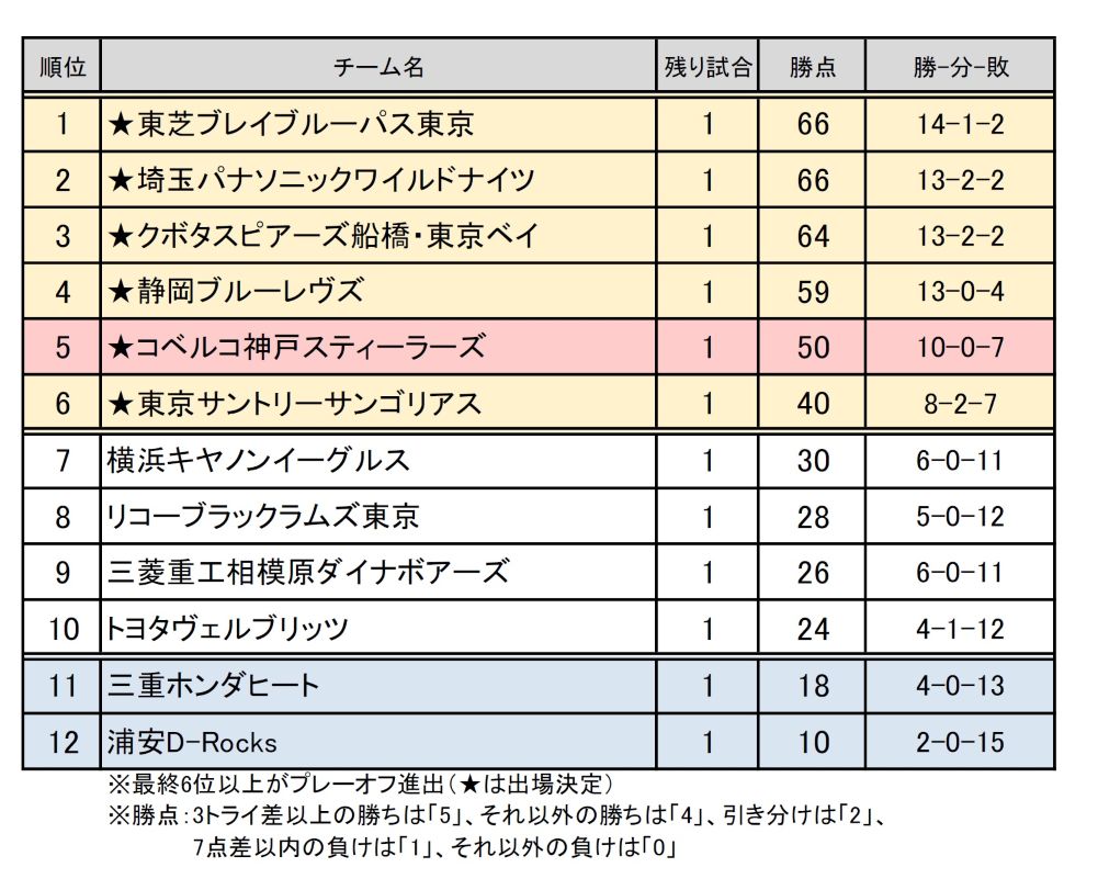 プレーオフ(PO)に進出する上位6チームが決定し、3連勝で勝点を「50」に伸ばした神戸スティーラーズは5位が確定。