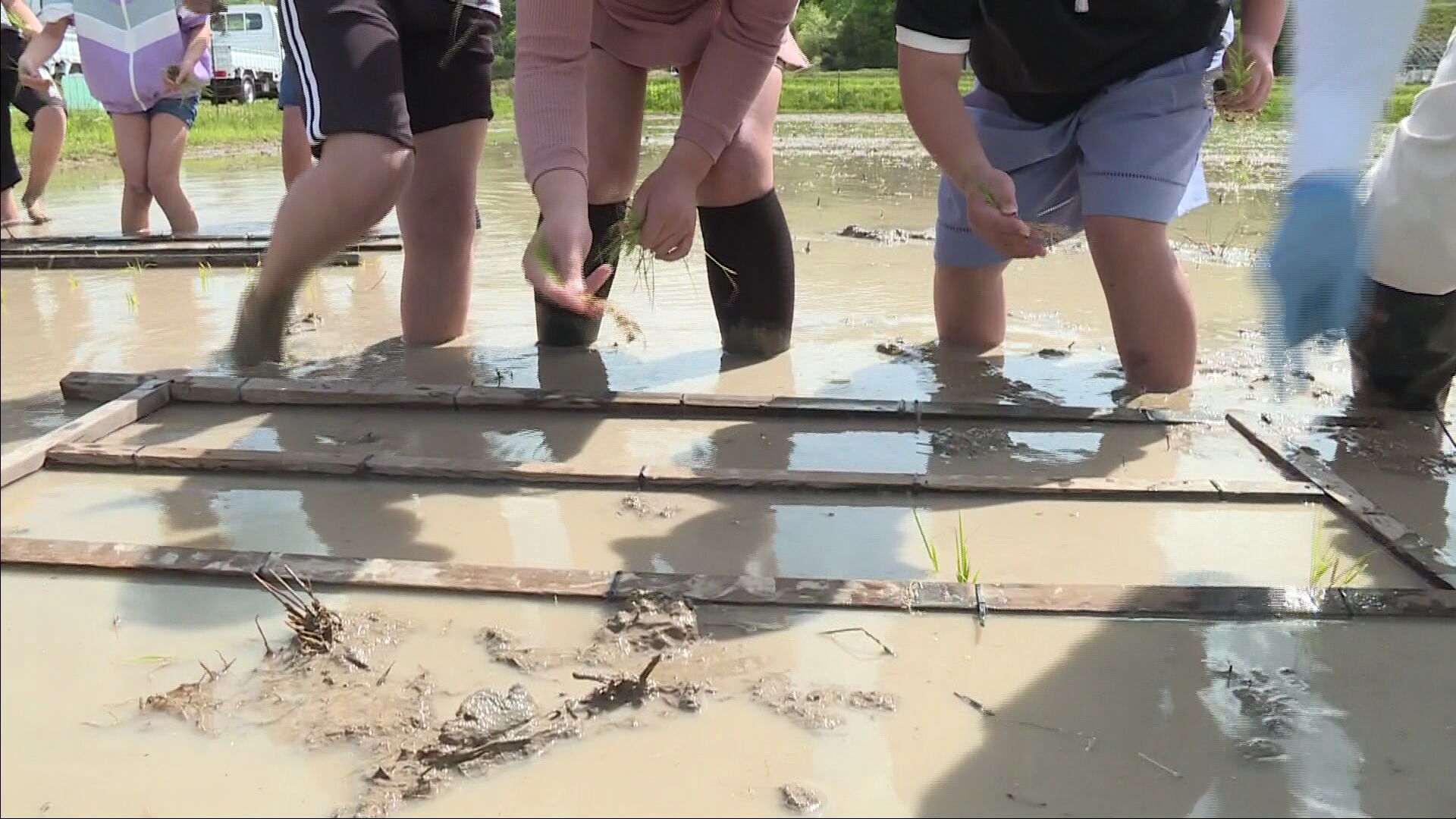 JAの職員から苗の植え方について説明を受けた児童たちは、はだしで田んぼに入り、泥に足をとられながらも手作業でていねいにコシヒカリの苗を植えていきました。