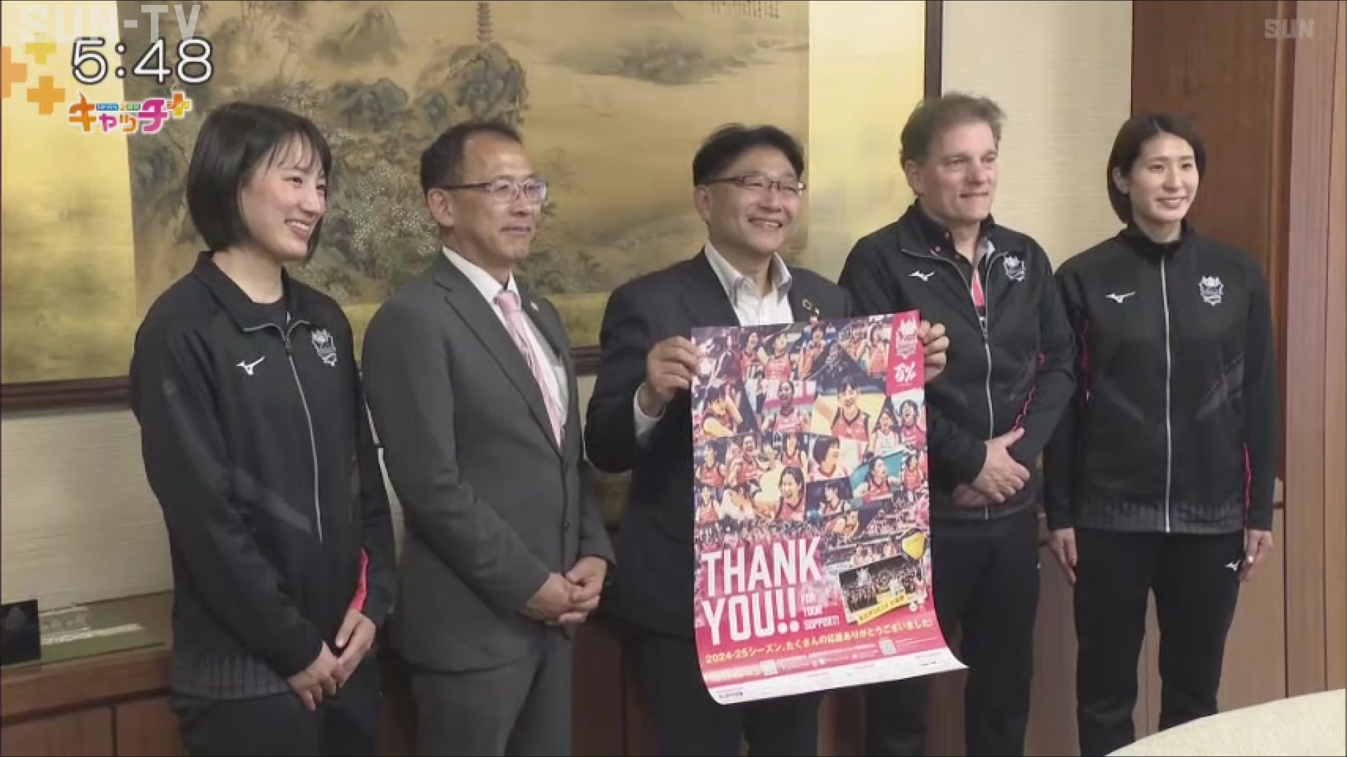 女子プロバレーボールチームのヴィクトリーナ姫路が、姫路市の清元市長を表敬訪問し、4月に終えたシーズンの成績と応援への感謝を伝えました。
