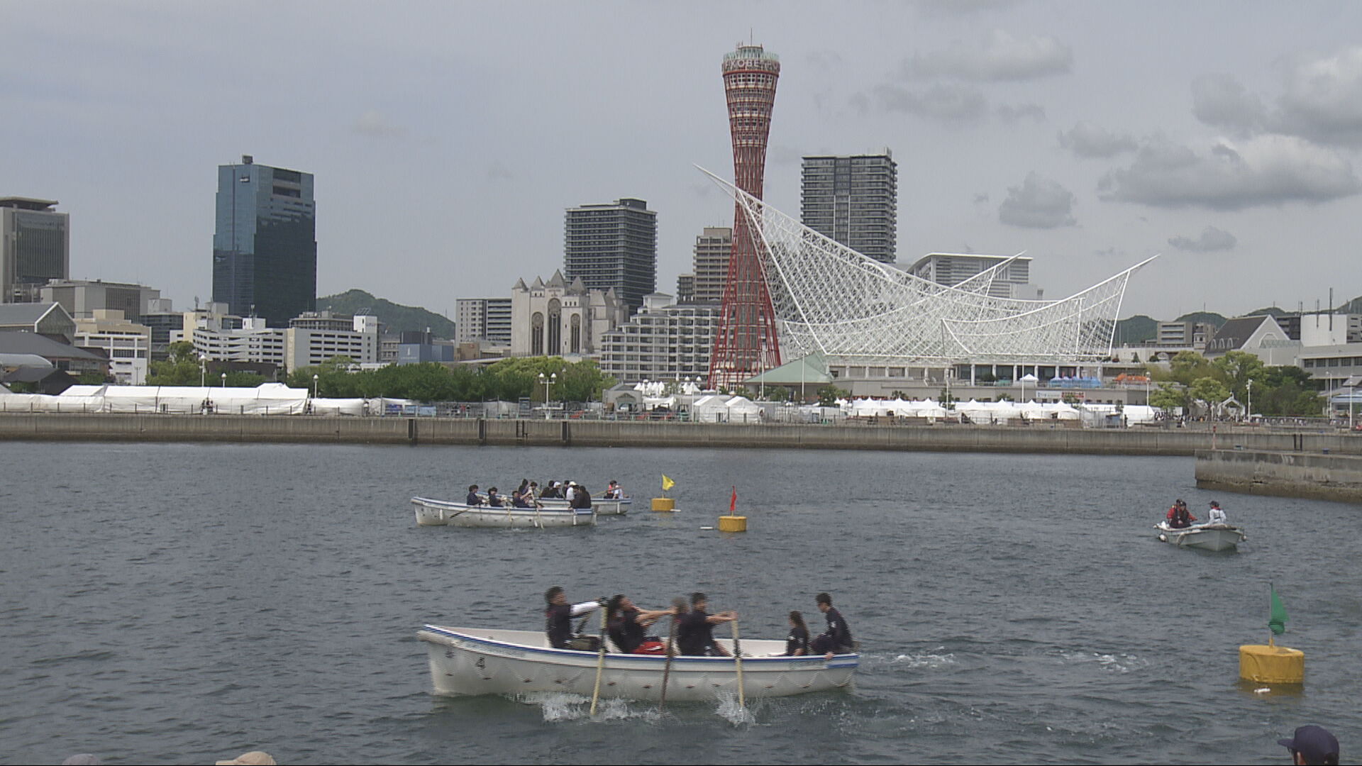 神戸港で毎年恒例のカッターレースが開かれ、港には応援に駆け付けた観客の元気な声援が響きわたりました。