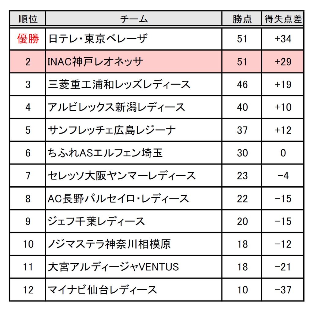 しかし首位の日テレ・東京ベレーザも勝利し、勝点は同点ながら得失点差(INAC神戸「+29」、ベレーザ「+34」)で上位のベレーザが初優勝した。