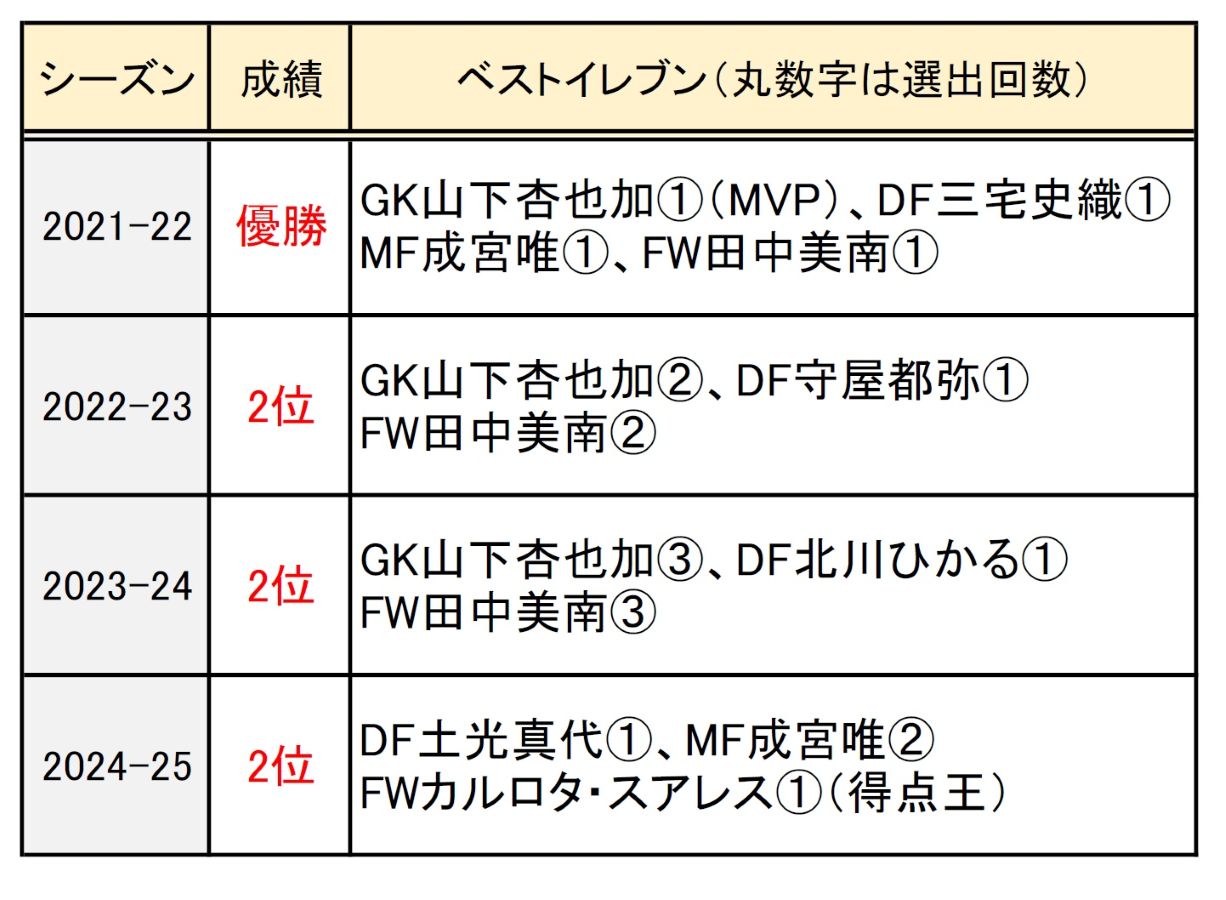 パリ五輪に出場した4人のうち、シーズン開幕前にGK山下杏也加、MF北川ひかる、FW田中美南の3人が海外移籍し、残るDF守屋都弥も2月に海外移籍した。