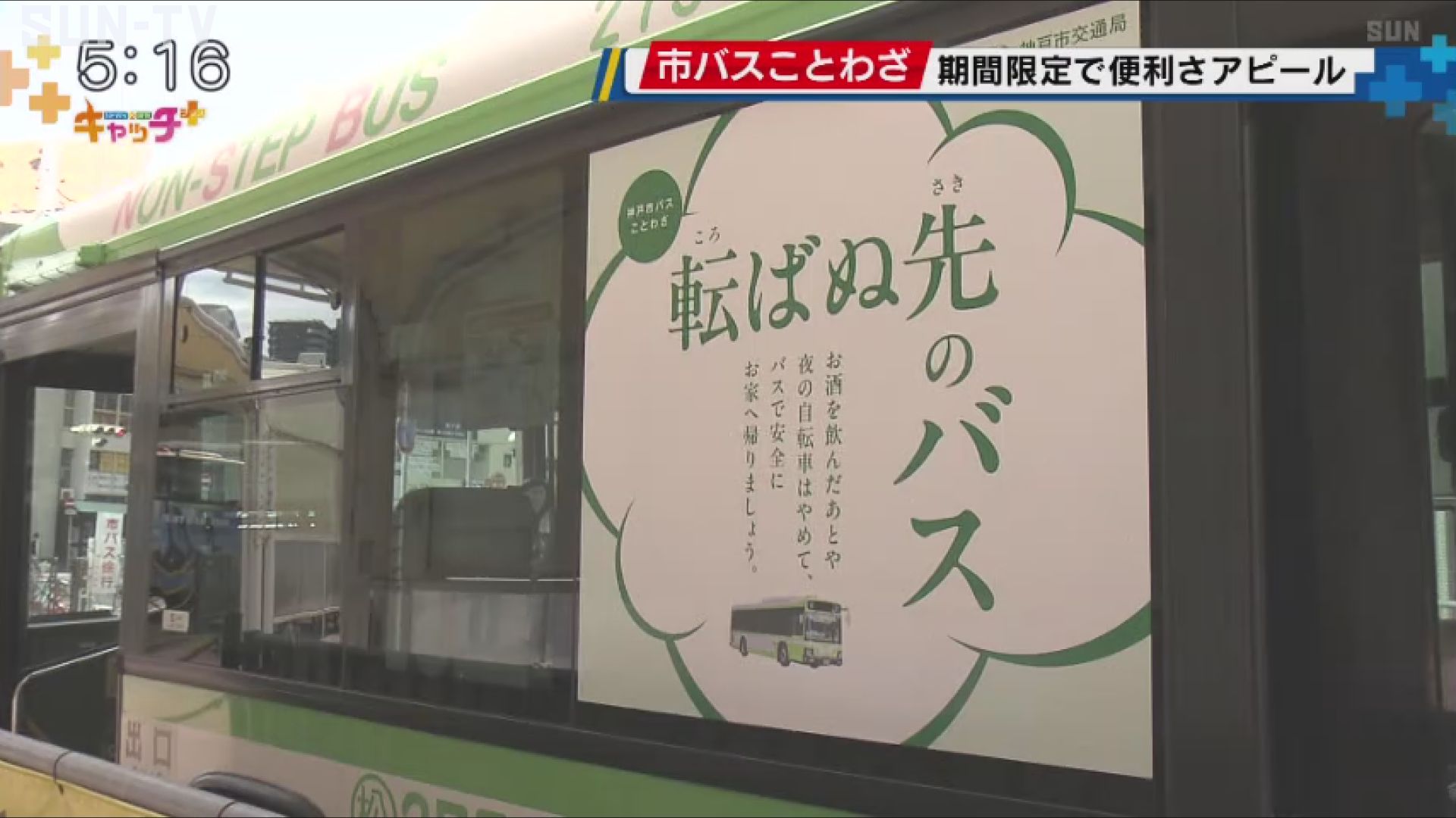 この取り組みは市バスのイメージアップを図ろうと神戸市交通局が4月から実施しているもので、合計8種類の「市バスことわざ」で、市バスの便利さや快適さをアピール。