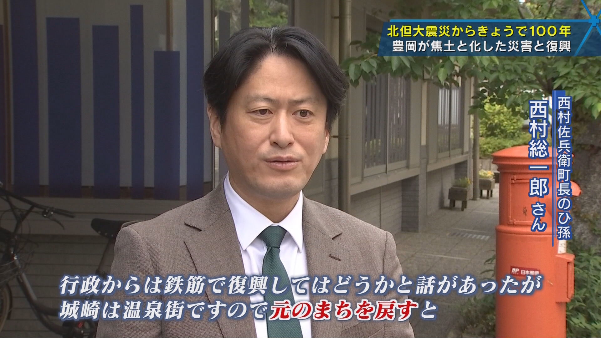 農村部を含む702戸のうちおよそ8割の548戸が全焼した旧城崎町。(北但震災誌より)旅館で昼食の準備をしていた時間帯で、272人の死者のうち7割が女性でした。行政主導で復興した豊岡とは違い、城崎では、住民主導で温泉街の景観を守りながらまちの再建を目指しました。100年前、城崎町の復興に尽力した西村佐兵衛町長。ひ孫にあたる西村総一郎さんは、震災100年のシンポジウムの実行委員長を務めました。