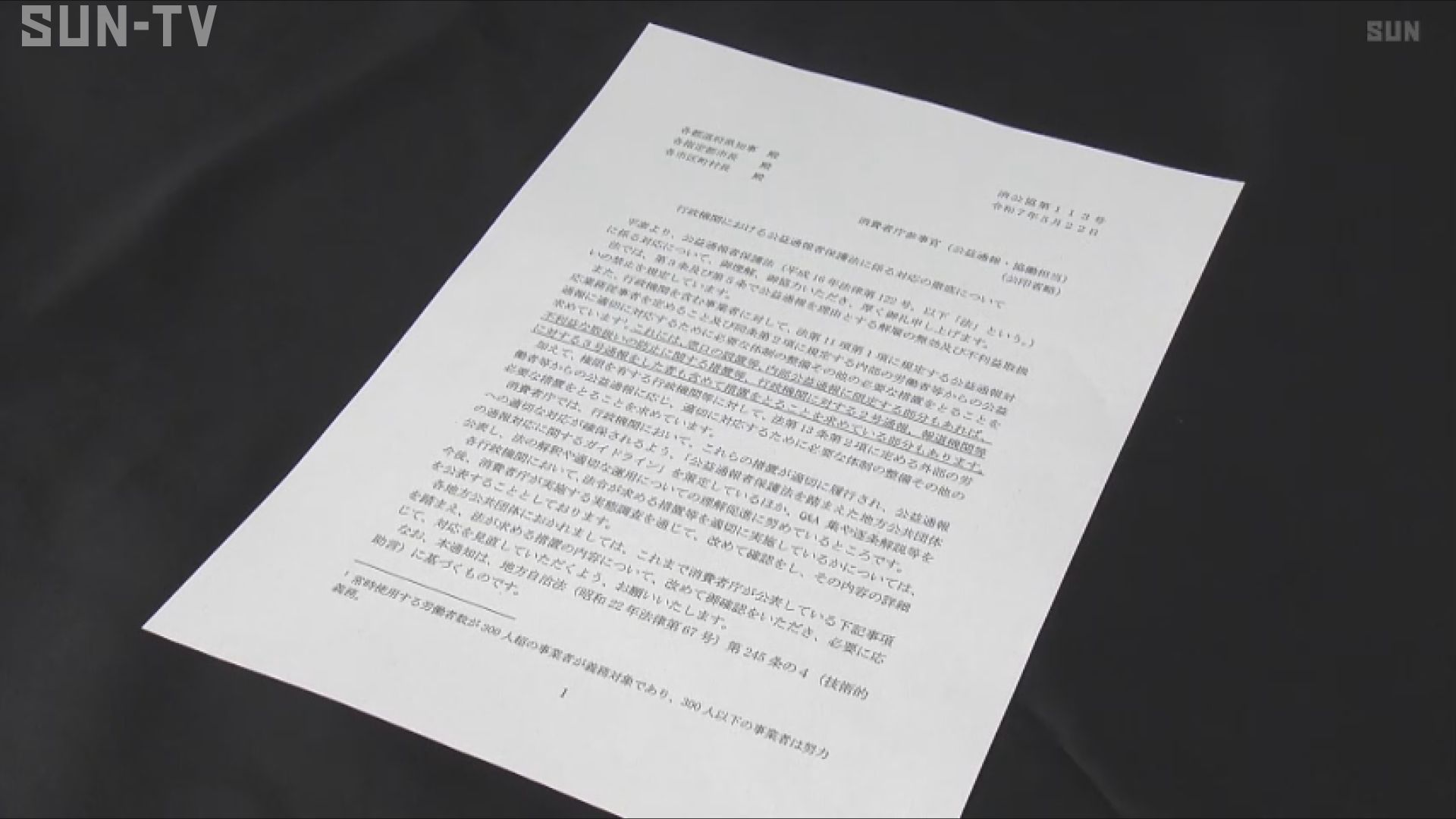 消費者庁は「外部通報も含めて必要な体制整備を求める」とする通知を、全国の自治体などに送っていたことが県への取材で分かりました。